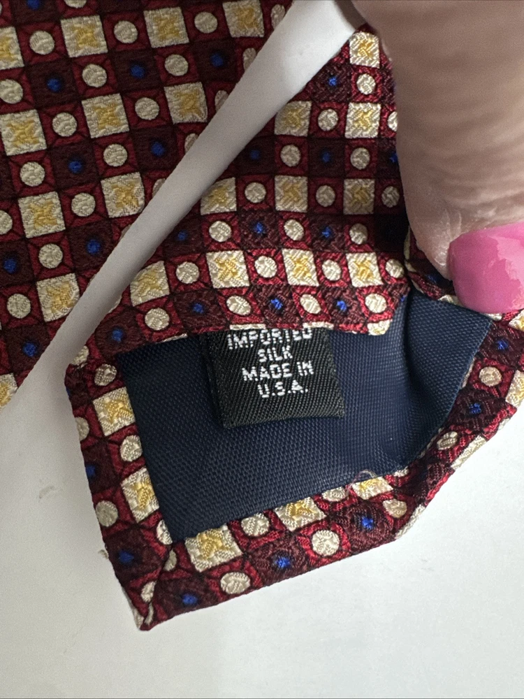 Crafted for the discerning gentleman, this Jos. A. Bank Signature Collection tie is a sartorial staple for any formal occasion. The luxurious silk fabric ensures a smooth, refined finish to your ensemble, while the classic lengths of 57 to 60 inches provide a perfect fit for most. The tie features a striking geometric pattern in red, gold, and blue hues, offering a contemporary twist on traditional business attire. Ideal for weddings, business meetings, or any upscale event, this designer tie exemplifies elegance. The exquisite design and high-quality material reflect the esteemed reputation of Jos. A. Bank, making it an essential addition to any well-dressed man's accessory collection. This item is new without tags, ensuring that you receive a pristine piece straight from the manufacturer. 57”