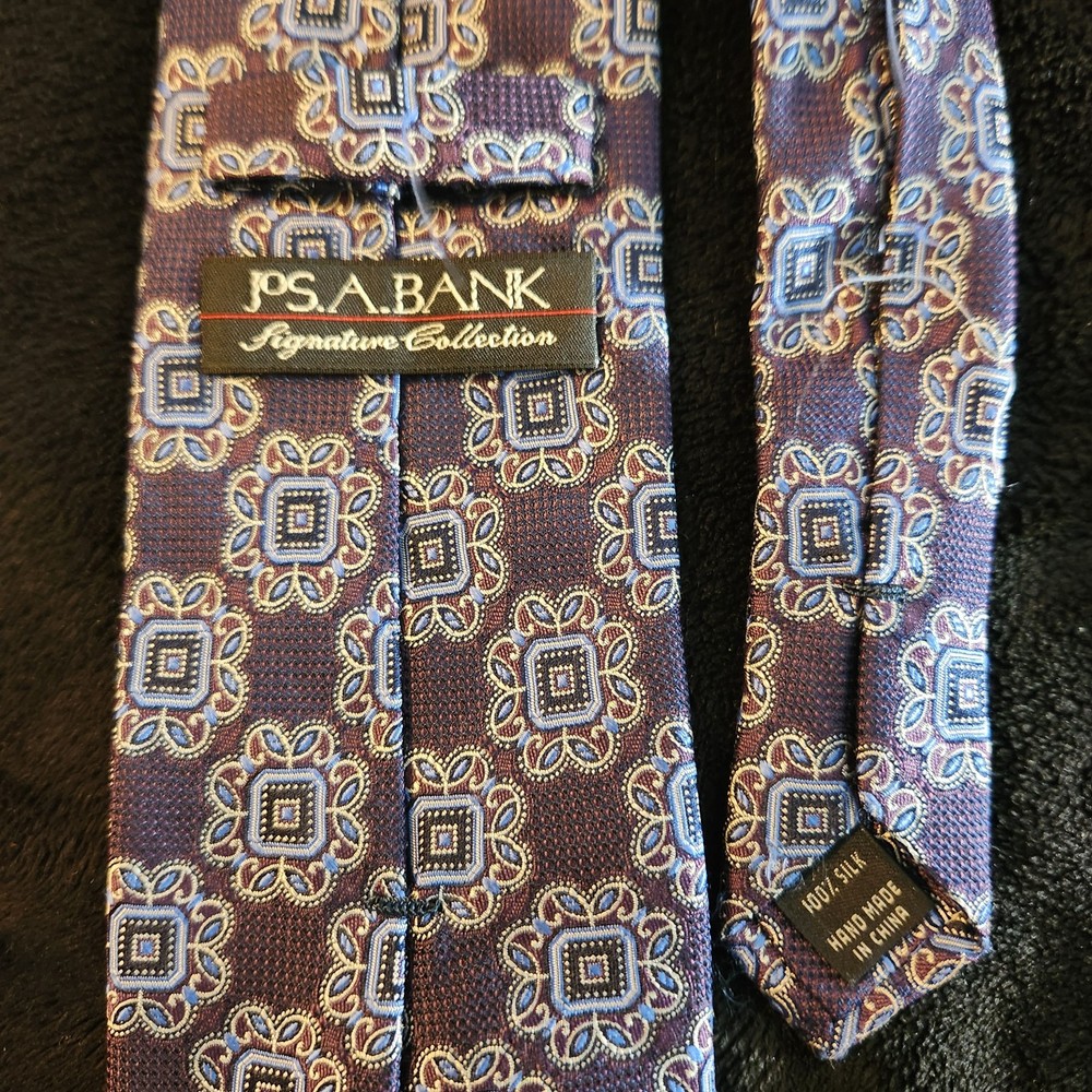 Jos A Bank Silk Tie Geometric Executive Collection Yellow Blue Orange Necktie No Stains No Smells No Holes or Tears from what we can see Normal Wear Message for any questions Check out my store for deals.