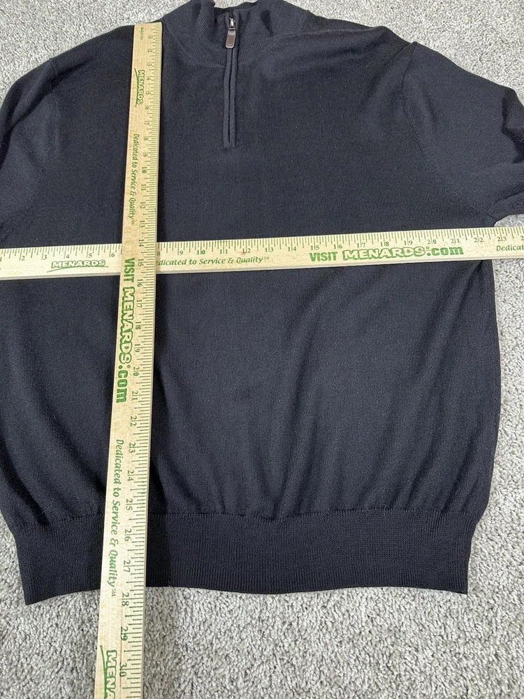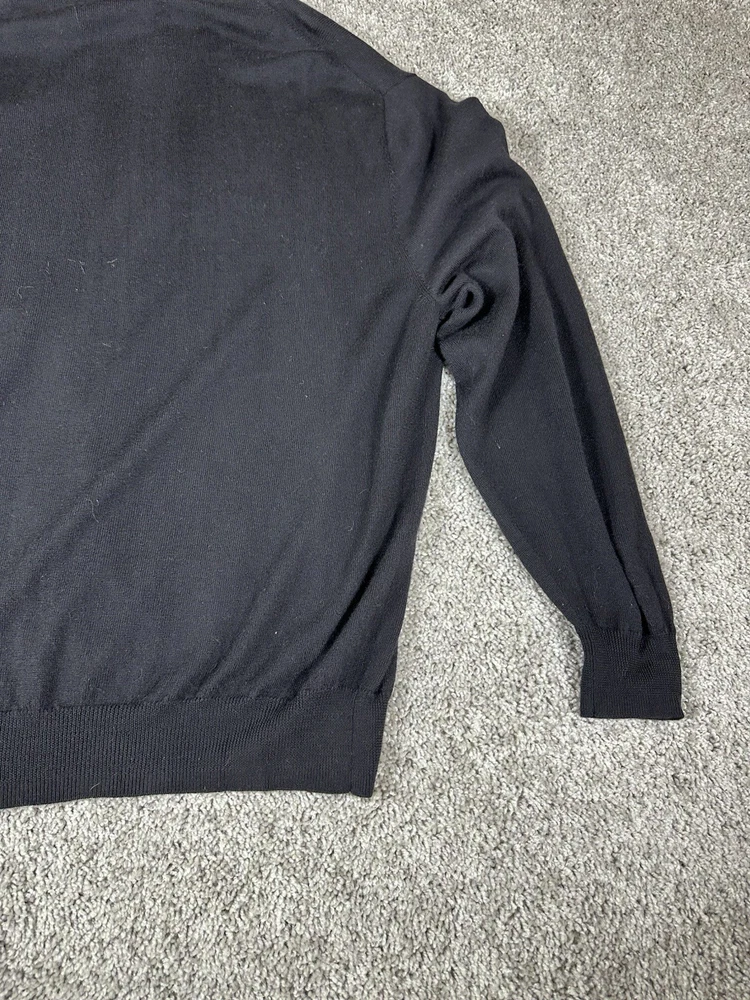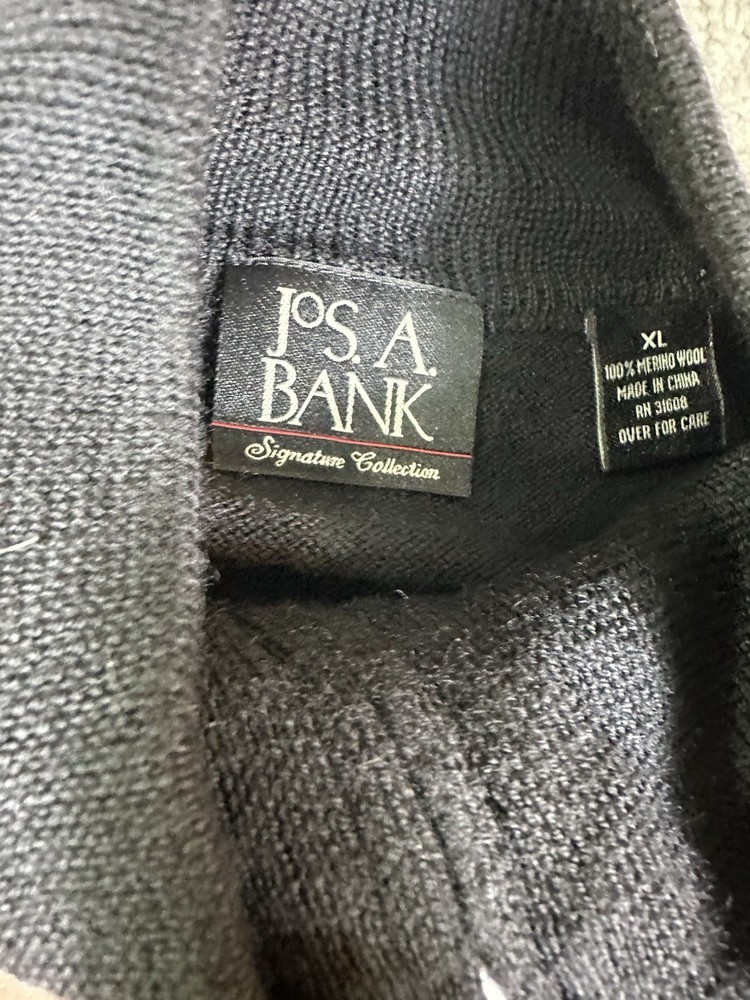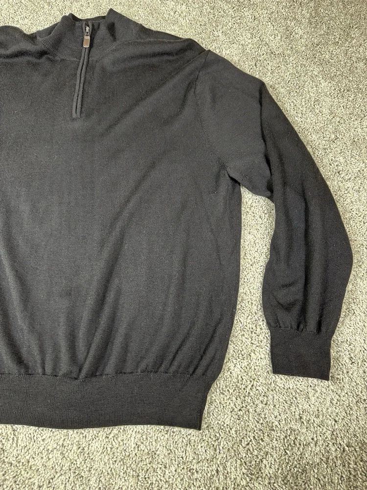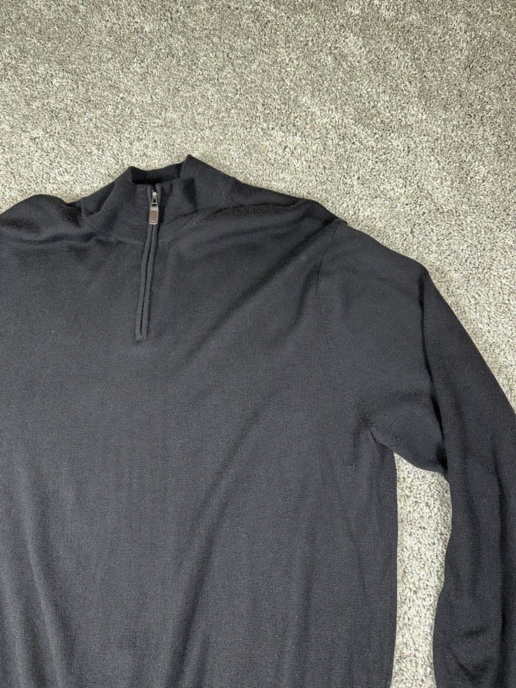 The Jos A Bank Traveler Merino Wool ¼ Zip Sweater in Men's size XL is a versatile and stylish piece perfect for travel, casual outings, or business meetings. Made of high-quality wool and featuring a mock neck neckline, this sweater offers warmth and sophistication. The pullover style, long sleeves, and solid black color make it a timeless wardrobe staple suitable for the winter, fall, and spring seasons. Easy to care for with its machine washable knit fabric, this sweater is a practical and fashionable choice for any man looking for a classic yet modern wardrobe essential. 2968