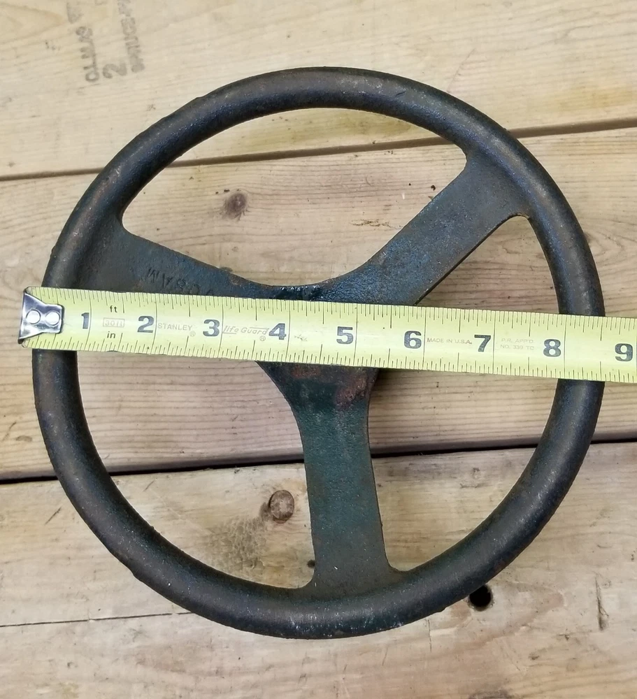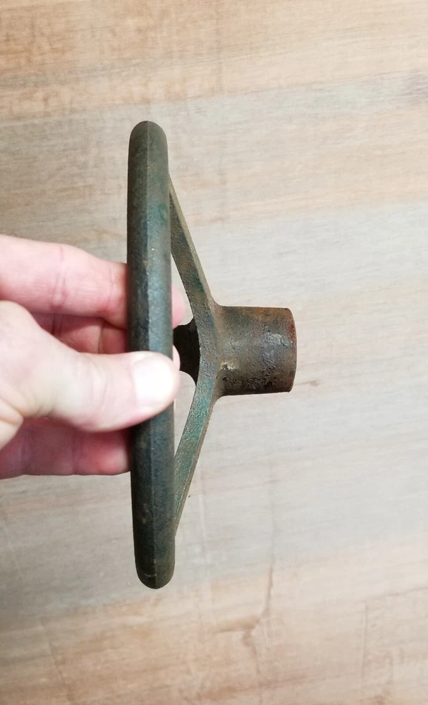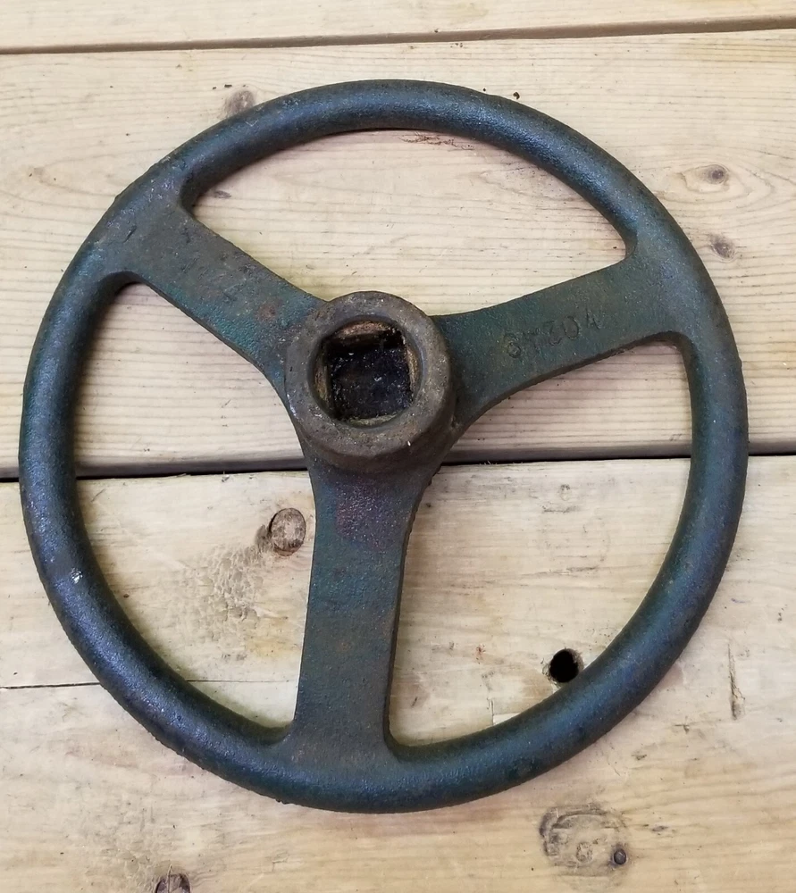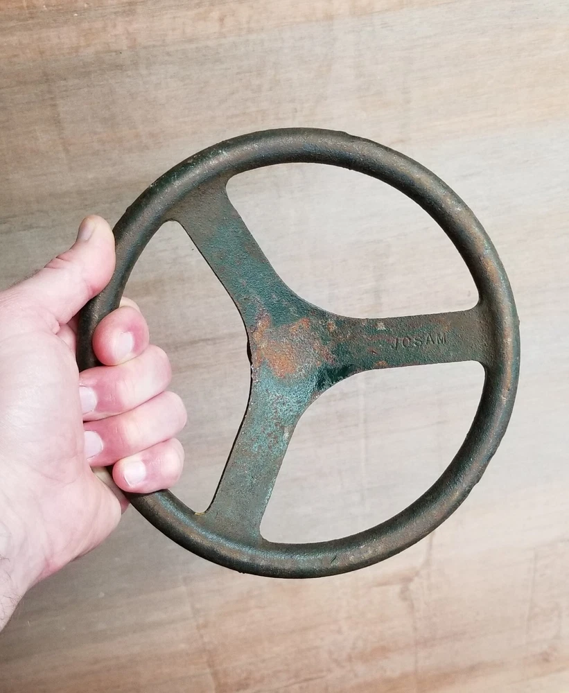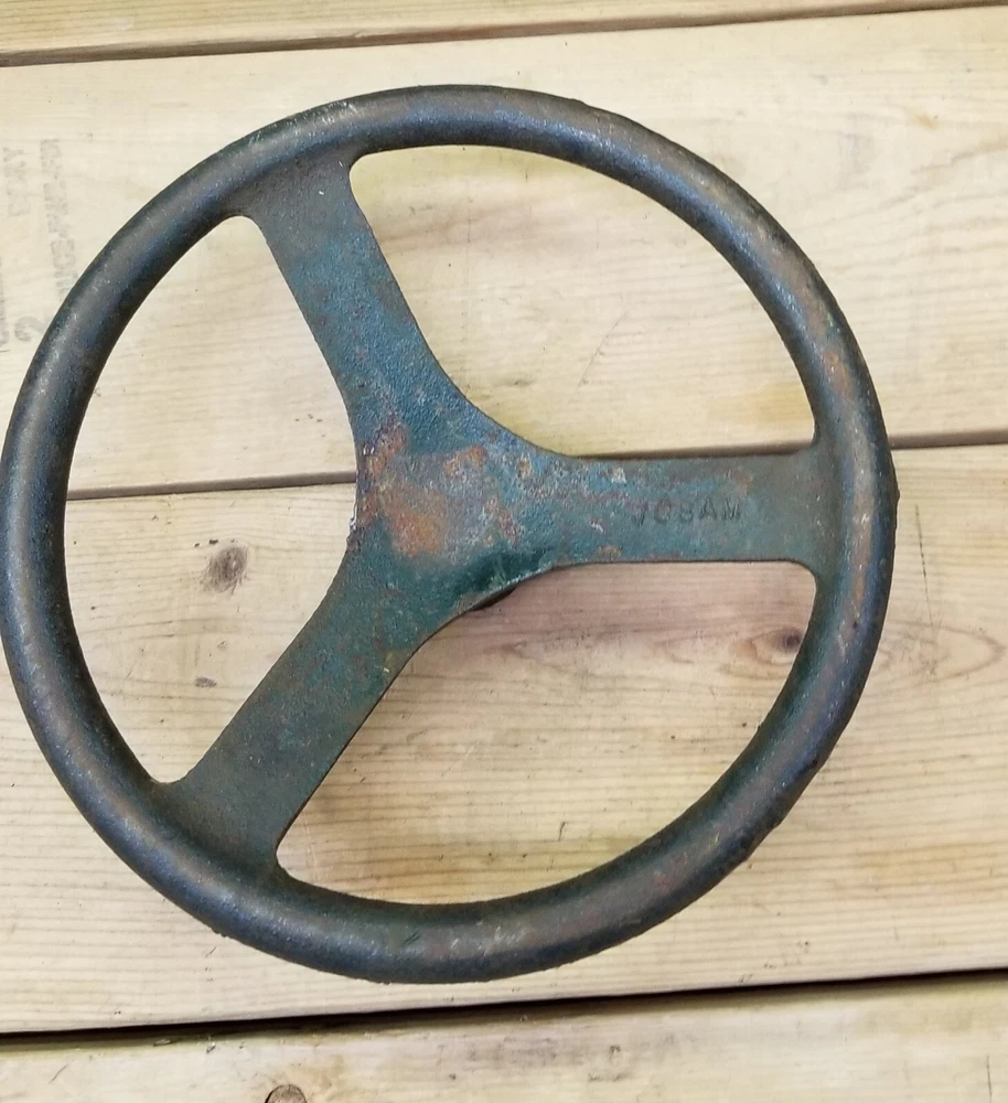 Josam Green Steampunk Industrial Factory 3 Spoke Valve Handle Steering Wheel. Steel / Cast Iron. The shape of this handle would make a great pedal car steering wheel. LOOK at all pictures for condition and size. 8 1/2" diameter.