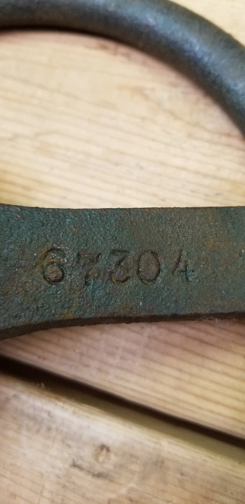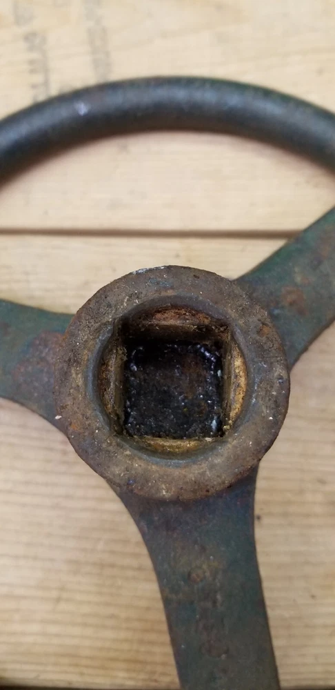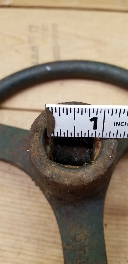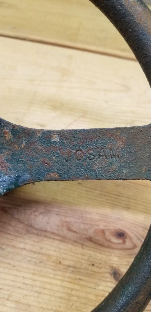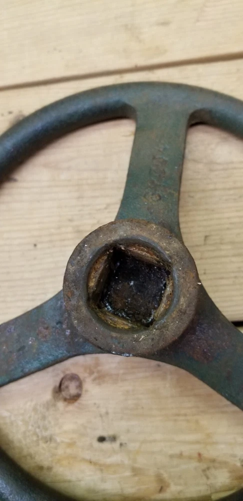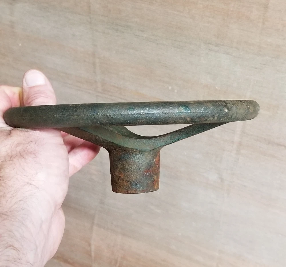 Josam Green Steampunk Industrial Factory 3 Spoke Valve Handle Steering Wheel. Steel / Cast Iron. The shape of this handle would make a great pedal car steering wheel. LOOK at all pictures for condition and size. 8 1/2" diameter.