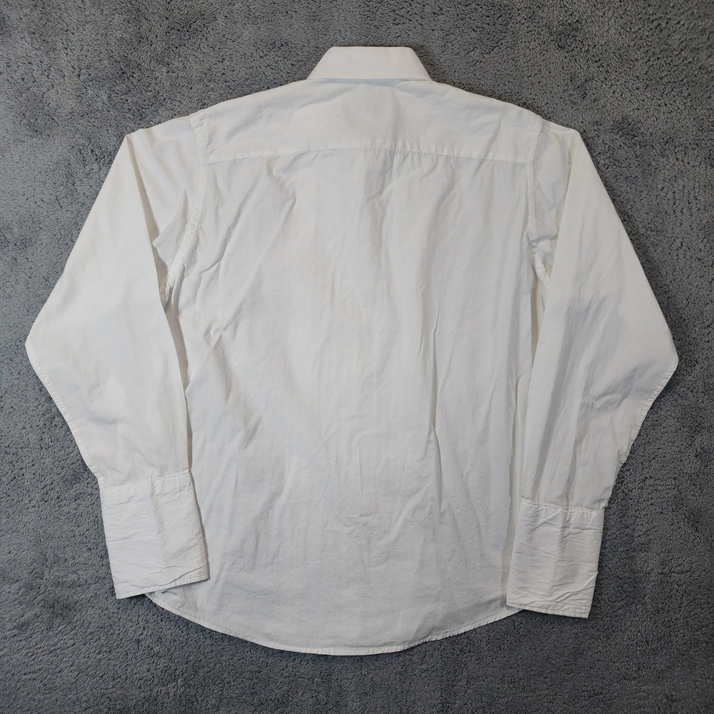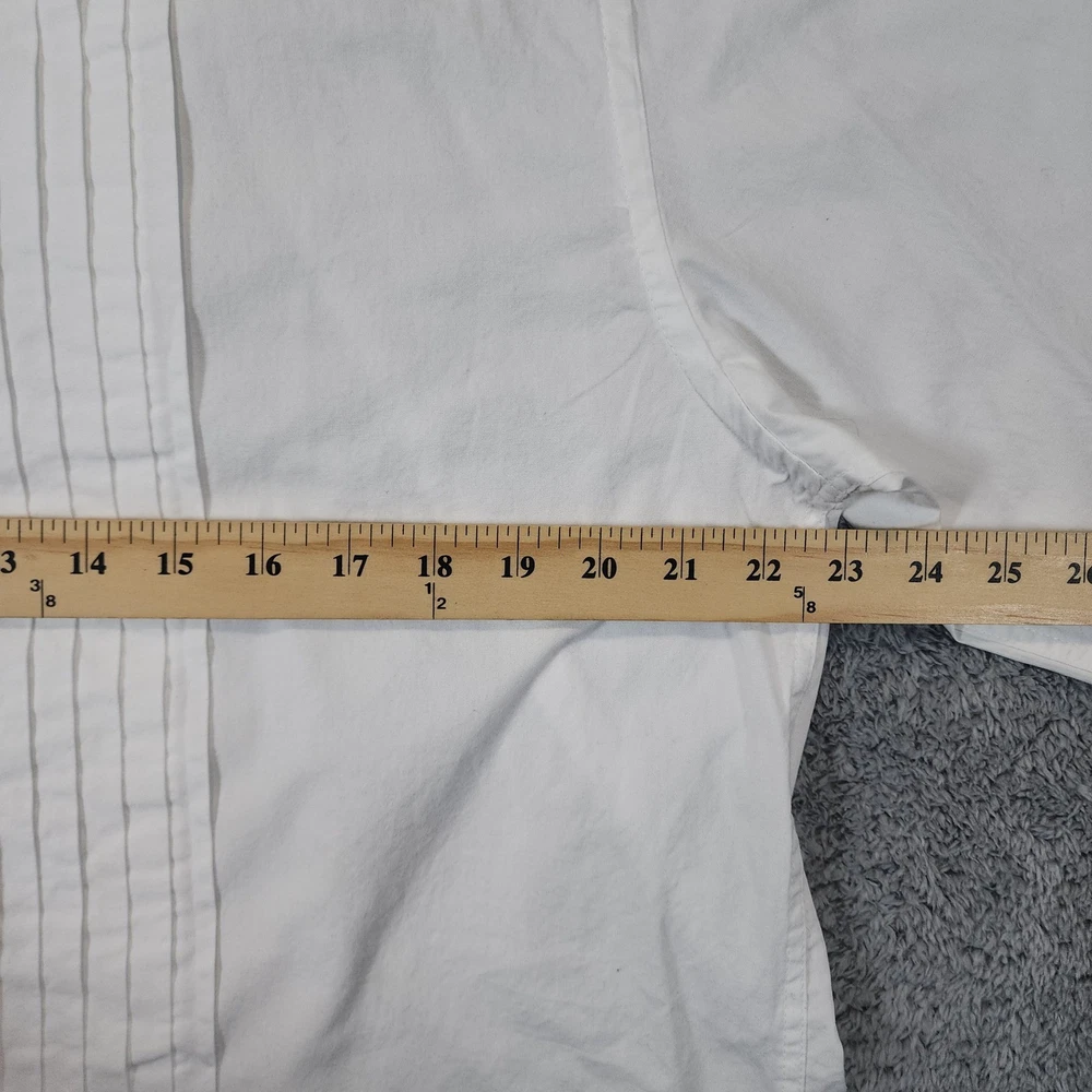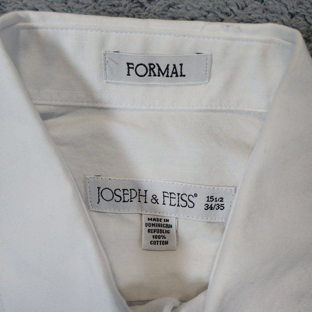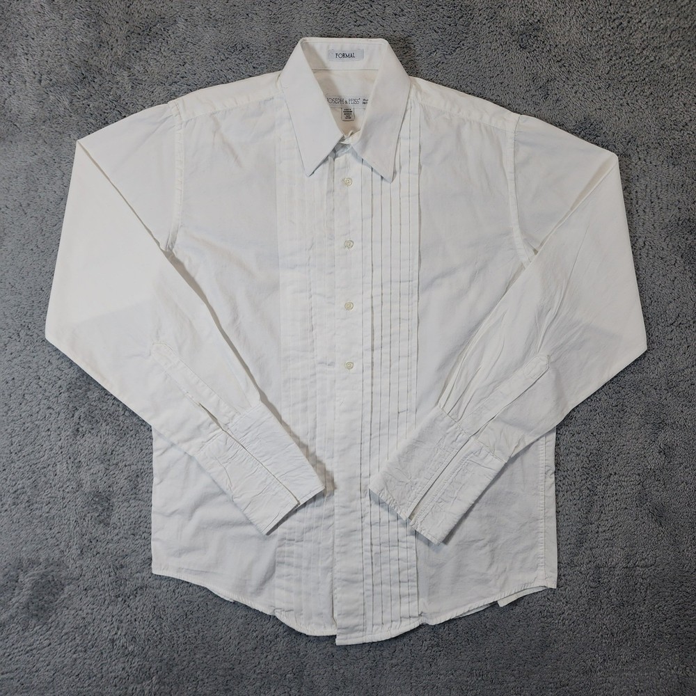 Joseph & Feiss formal tuxedo shirt in a crisp white cotton fabric. This long-sleeve dress shirt features a classic pleated bib front and traditional French cuffs, perfect for black-tie events or formal weddings. The point collar provides a sharp, clean look, while the 100% cotton construction ensures breathability and comfort throughout the evening. Measurements: • Pit to Pit: 23" • Length: 30" Brand: Joseph & Feiss Material: 100% Cotton Style: Tuxedo Shirt Pattern: Solid with Pleated Bib Sleeve Length: Long Sleeve Cuff Style: French Cuff Collar: Point Closure: Button Front Fit: Regular Keywords: Formal, Black Tie, Wedding, Prom, Gala, Classic, Traditional, Pleated Front, French Cuffs, Crisp, Elegant, Sophisticated, Groom, Groomsmen, Evening Wear Excellent condition, gently worn and well cared for. Handling time: Same day or 1 business day USPS Ground Advantage Shipping