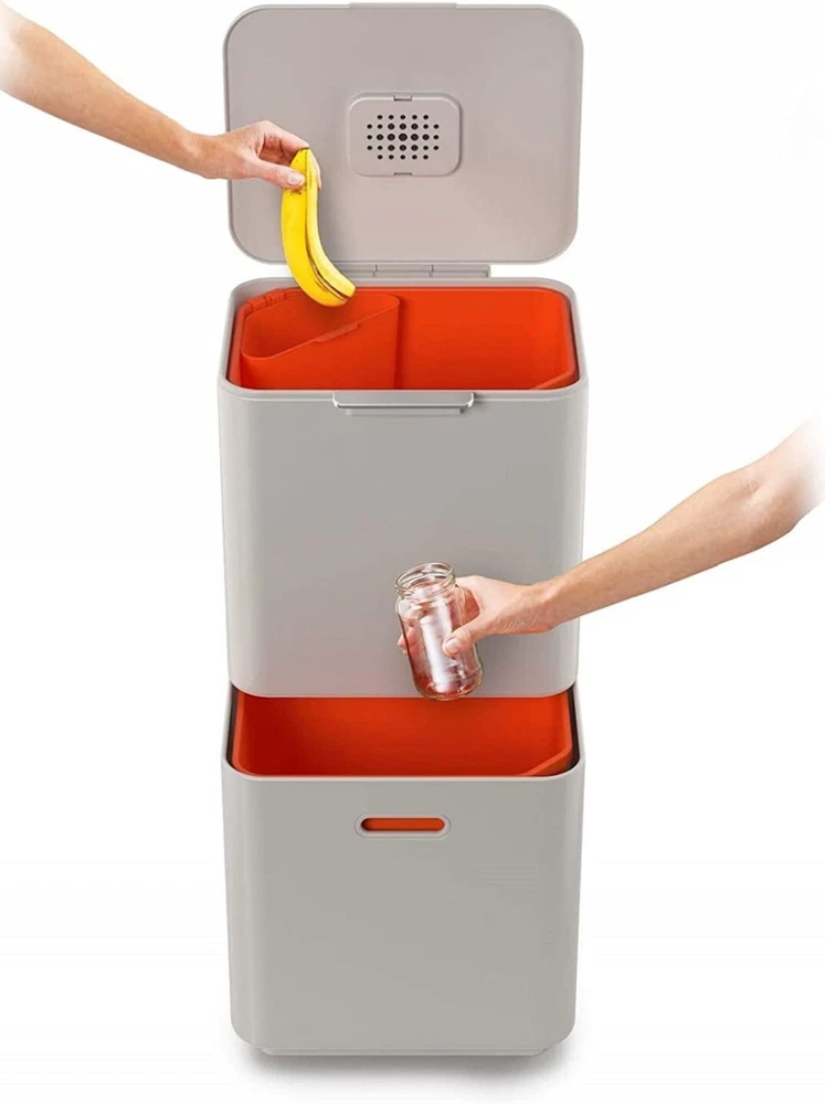 This Joseph Joseph Totem Max Waste & Recycling Bin in is a 60-liter capacity bin with two compartments for waste and recycling. It is square in shape, made of plastic material, and has a contemporary style with a white eggshell finish. The bin measures 18 inches in length, more than 24 inches in height, and 16 inches in width. It is free-standing and suitable for home organization in the kitchen or any household area.