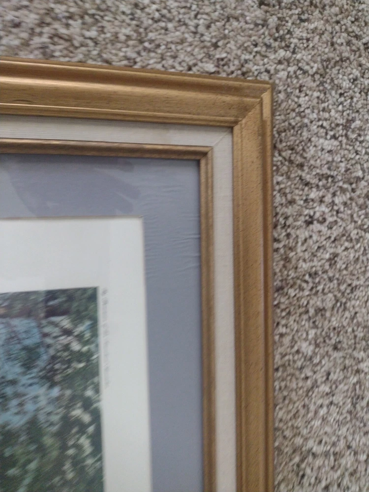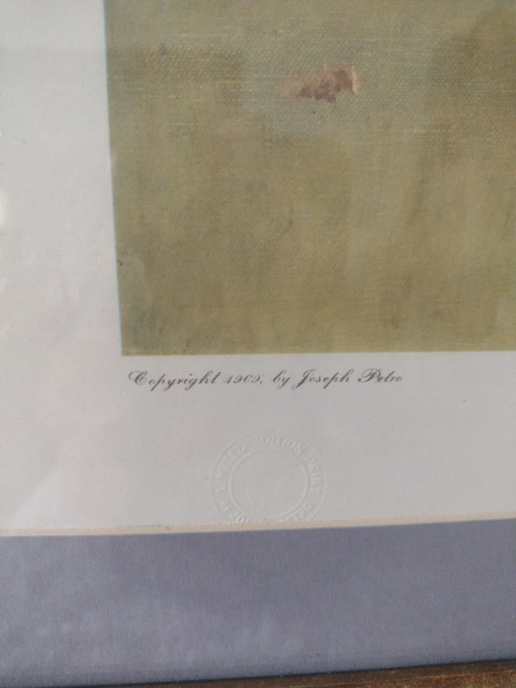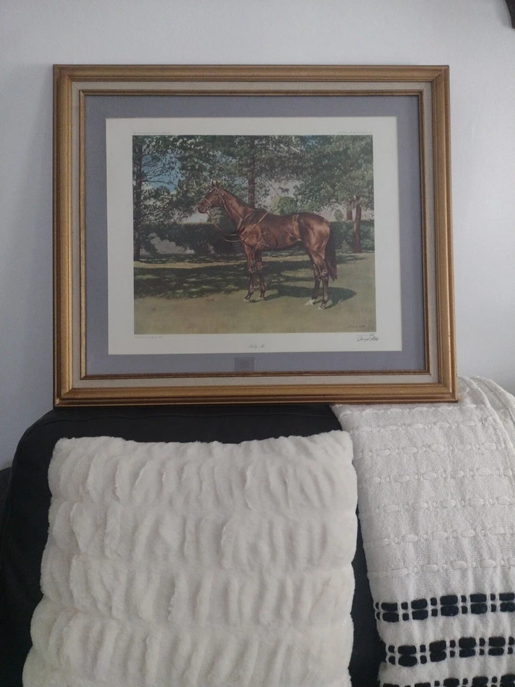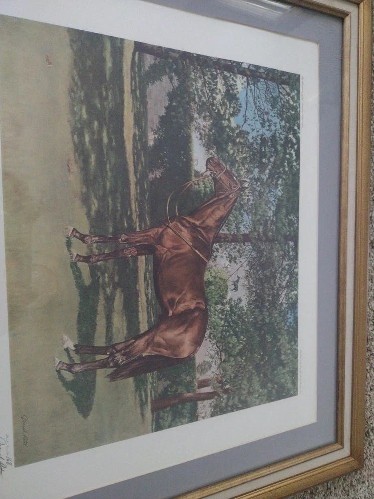 This limited edition print by Joseph Petro titled "Toby B" features a portrait of a horse racing subject. The print is a licensed reprint produced in 1969 and is signed by the artist. It measures 28 inches in length, 24 inches in height, and has a 2-inch width. The print is matted and framed, making it ready to display. It is a medium-sized print that would make a great addition to any art collection, especially for those who appreciate animal themes. The print does not come with a Certificate of Authenticity (COA). There is a slight water mark on the upper corner of the matte as pictured.