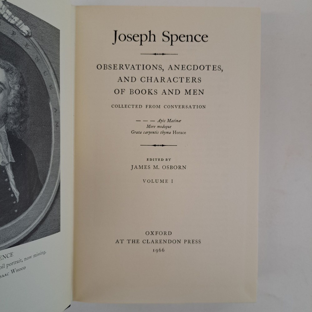 Binding: Hardcover Author: Spence, Joseph; Osborn, James M. [Editor Publisher: Clarendon Press Special Attributes: 1st Edition, Dust Jacket Language: English Original/Facsimile: Original Year Printed: 1966