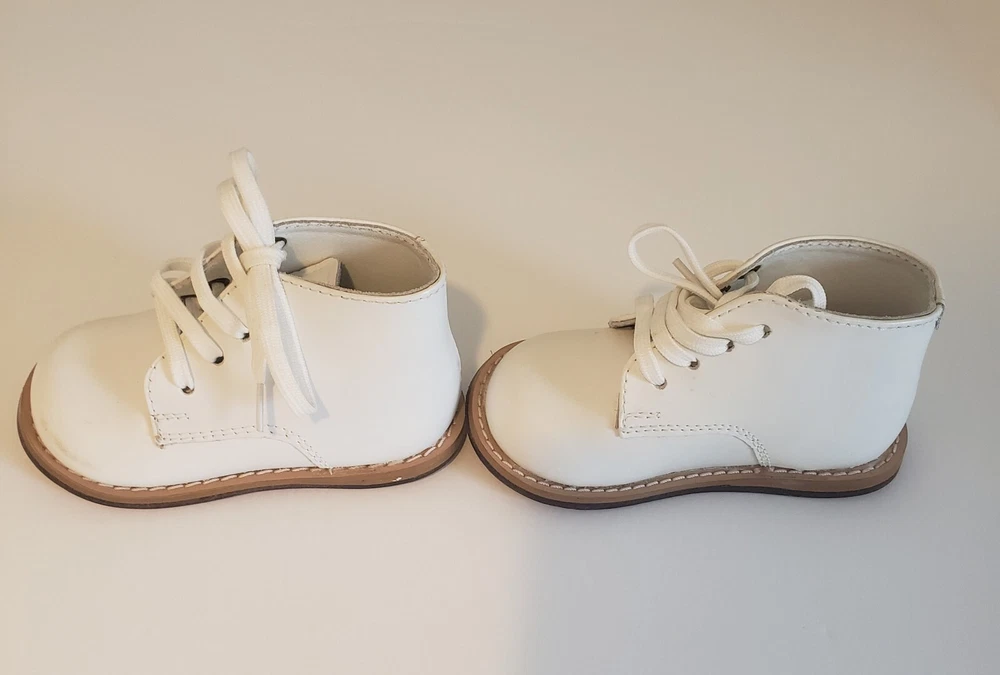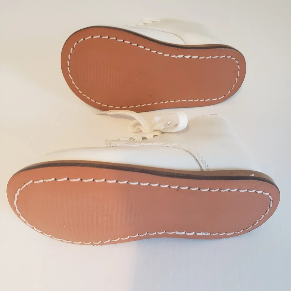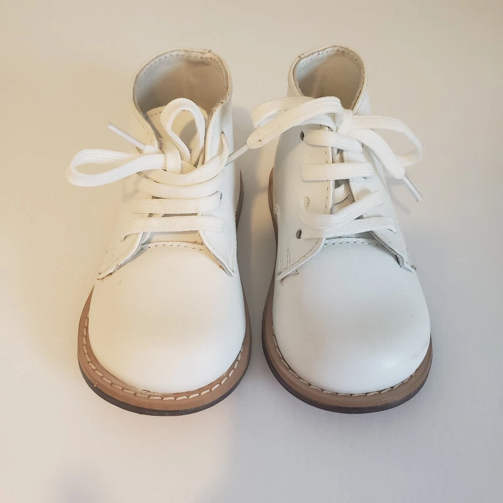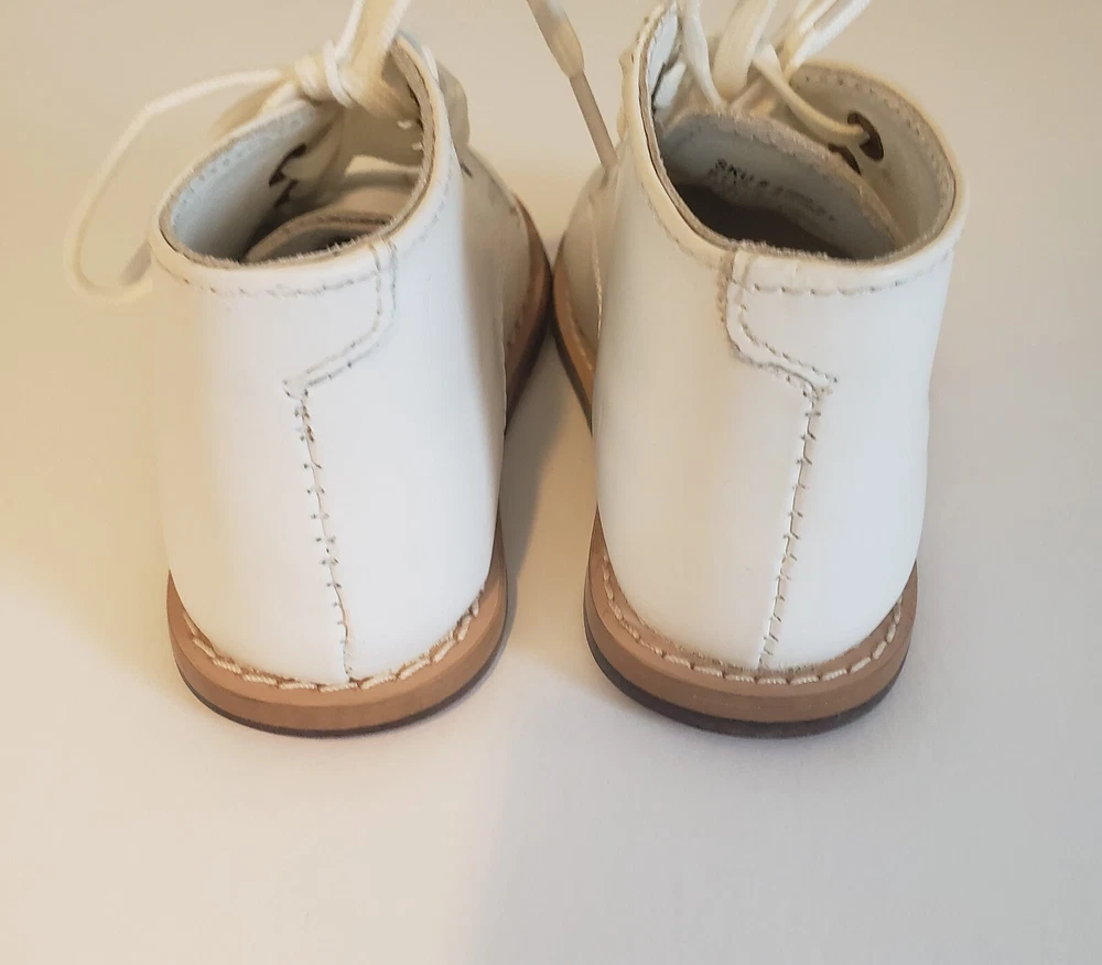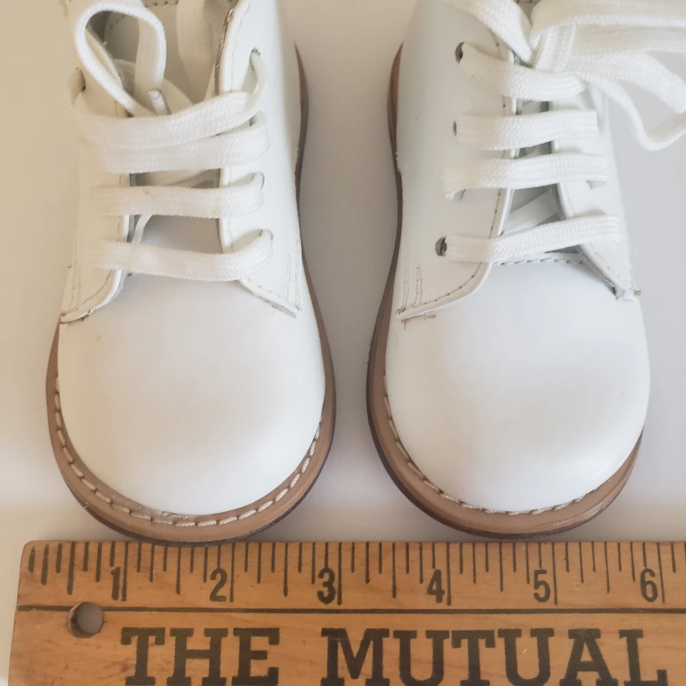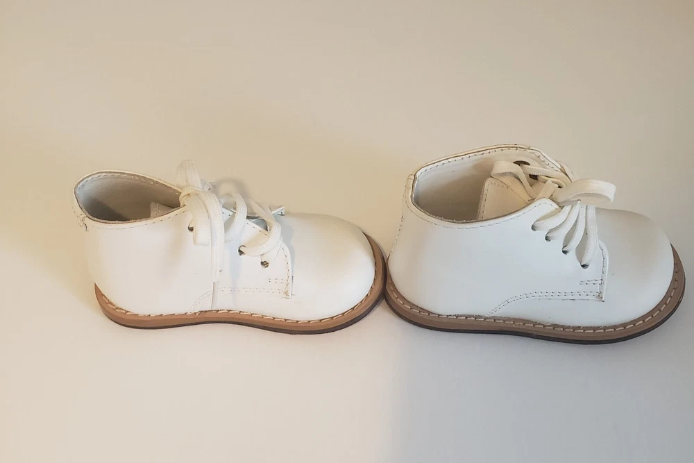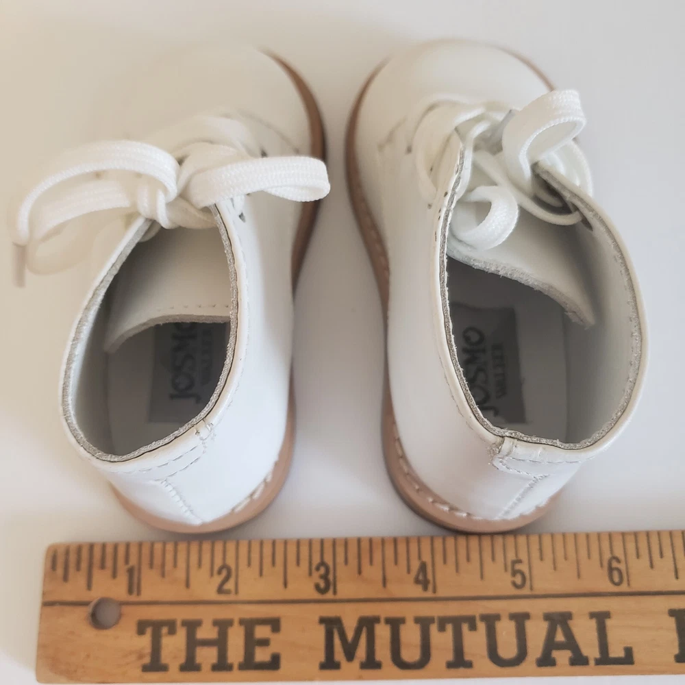 Light scuff on left shoe. Josmo Baby Walker Shoes. Size 5, White, Oxford Very Good Condition. Leather upper, lining, and sole.