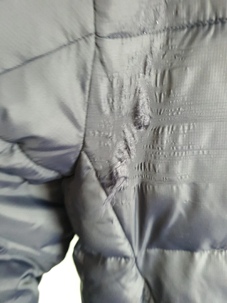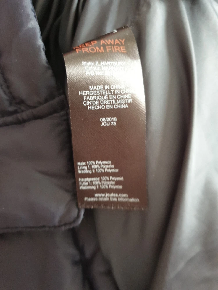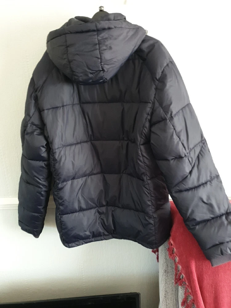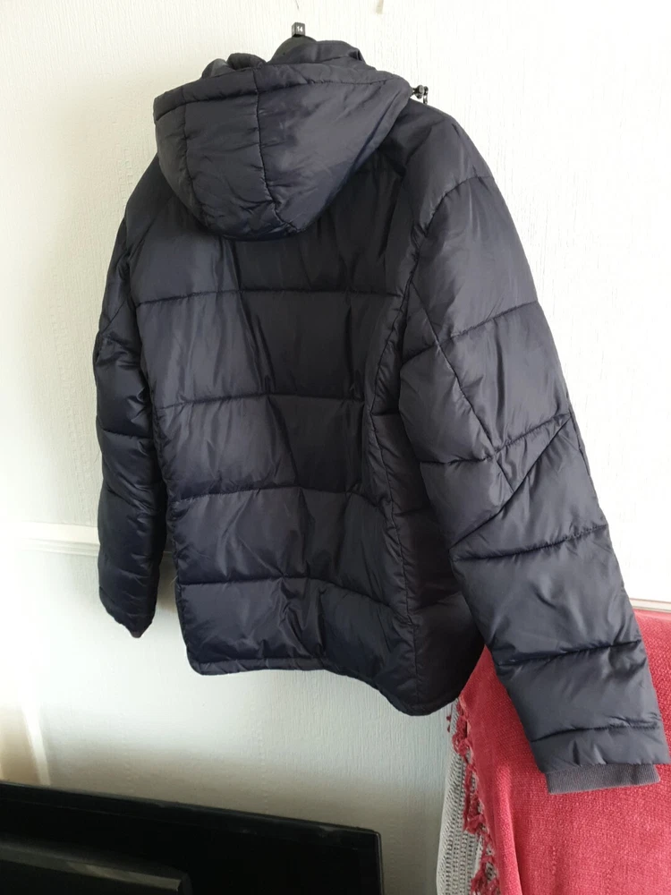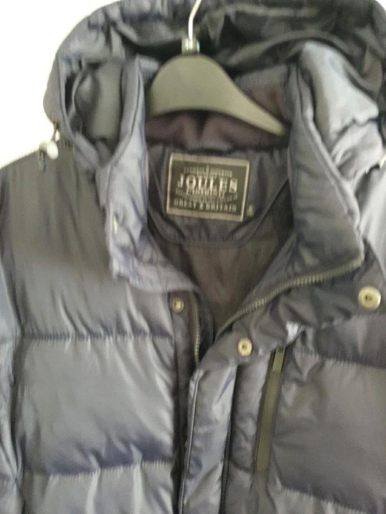 Joules Hartbury padded puffer jacket UK Medium Navy Full zip and snap button closure Two zip up hip pockets and one zip up breast pocket Zip up inside pocket 23'' pit to pit 30'' from shoulder to bottom hem Good but there is a few pulls due to the cat - see photo's