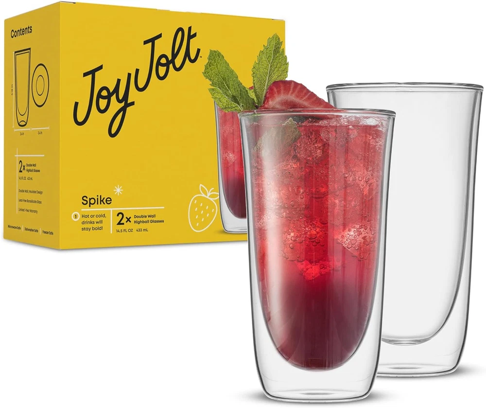 JoyJolt Spike Double Wall Glasses, Cocktail 2 Count (Pack of 1), Highball Product Details Brand: JoyJolt Color: Highball Special Feature: Double Wall,Double Walled Style: double wall glass Theme: Holiday Recommended Uses For Product: Home Included Components: Straw Shape: Round Pattern: Solid Product Care Instructions: Machine Wash, Microwave Safe, Hand Wash Only Age Range (Description): Adult Material Feature: Insulated Reusability: Reusable Unit Count: 2 Count Product Dimensions: 4"W x 6.75"H Number of Items: 2 Manufacturer: JoyJolt Size: 2 Count (Pack of 1) Item Weight: 13.5 ounces Item model number: JG10215 Is Discontinued By Manufacturer: No MaterialCapacity: Borosilicate Glass13.5 ounces OccasionItem Weight: Casual,Home13.5 Ounces IMPRESS YOUR GUESTS - Get this wonderful set of 2 drink glasses to entertain your guests at parties, weekend getaways and the holidays. Or just use at home for an evening of ambiance. DURABLE AND FUNCTIONAL - Keep your hands and tabletop dry, no condensation will form on the outside of the glass. Use it for your favorite juice or beverage of choice. A great addition to any table and can be used for casual dining or more elegant affairs. DESIGN AND COMFORT - A design that is practical and visually appealing makes this an exciting product for any home, restaurant or café. The double wall stylishly creates dramatic optical illusion, making a stunning presentation! WELL CHILLED - Insulated glasses keeps cold drinks cold and hot drinks hot, while the outside surface always feels comfortable in your hand. Its two walls allow you to hold onto a piping hot glass of hot drinks without burning your fingers, or prevent condensation from forming on the outer wall while holding a cold beverage. DOUBLE WALL BOROSILICATE GLASS - Crafted from strong borosilicate, these glasses are thinner, lighter, scratch and break resistant. They are also strong enough for your dishwasher, will not cloud after washing, and is also microwave safe making them perfect for everyday use.