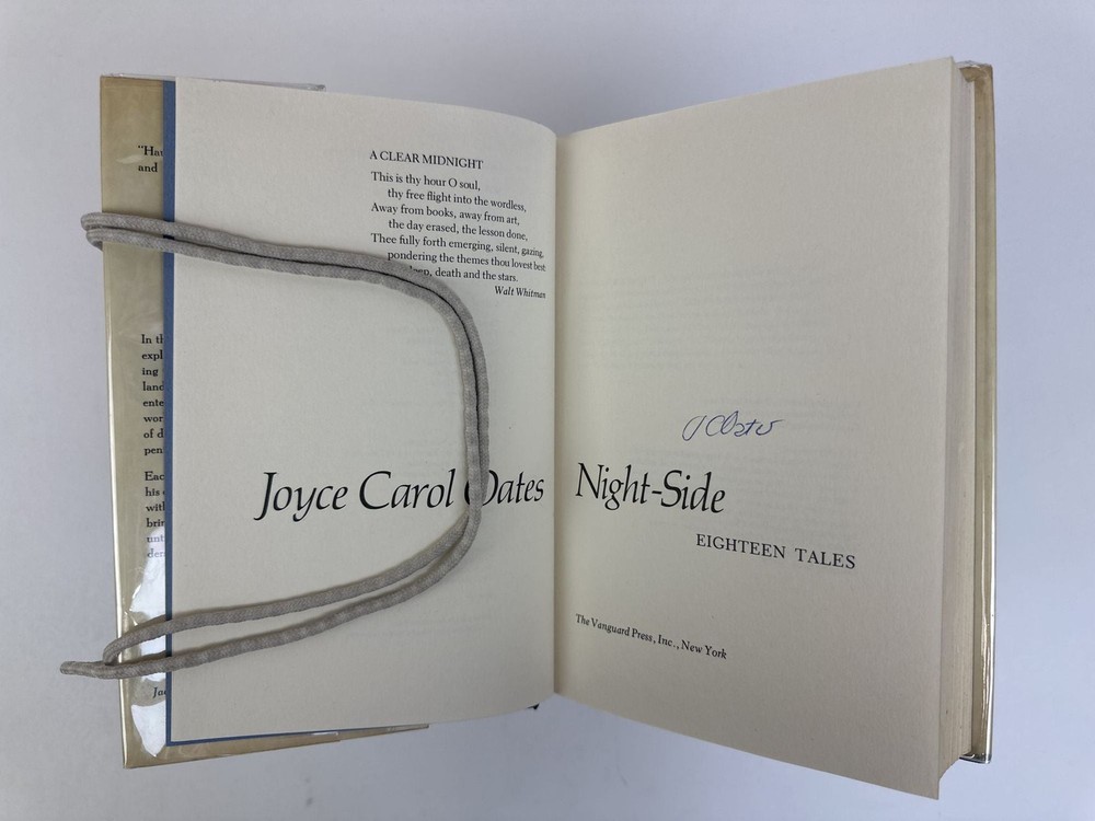 NIGHT-SIDE [Signed] Author: Oates, Joyce Carol Title: NIGHT-SIDE [Signed] Publication: New York: The Vanguard Press, 1977 Edition: First Edition Description: Octavo, 370 pages. In Very Good condition with Very Good minus dust jacket. Tan spine with blue and black lettering. Dust jacket protected in mylar covering. Price uncut: "$10.00". Dust jacket with light plus bumping and wear to head and tail of spine, edges and corners; minor damp staining to tail of jacket spine. Binding with light bumping to head and tail of spine. Text block with light staining to top edge of text block; small patch of damp staining to lower corner of text block. Signed flat by Oates on title page. Shelved in Room C. Seller ID: 1392597 Subject: Literature Welcome to the eBay store of Second Story Books! DC's Oldest Rare and Used Bookstore, Second Story Books operates two open shops in the Washington D.C. metropolitan area. We have an extensive internet presence and provide accredited appraisals member ASA. This listing was created by Bibliopolis.