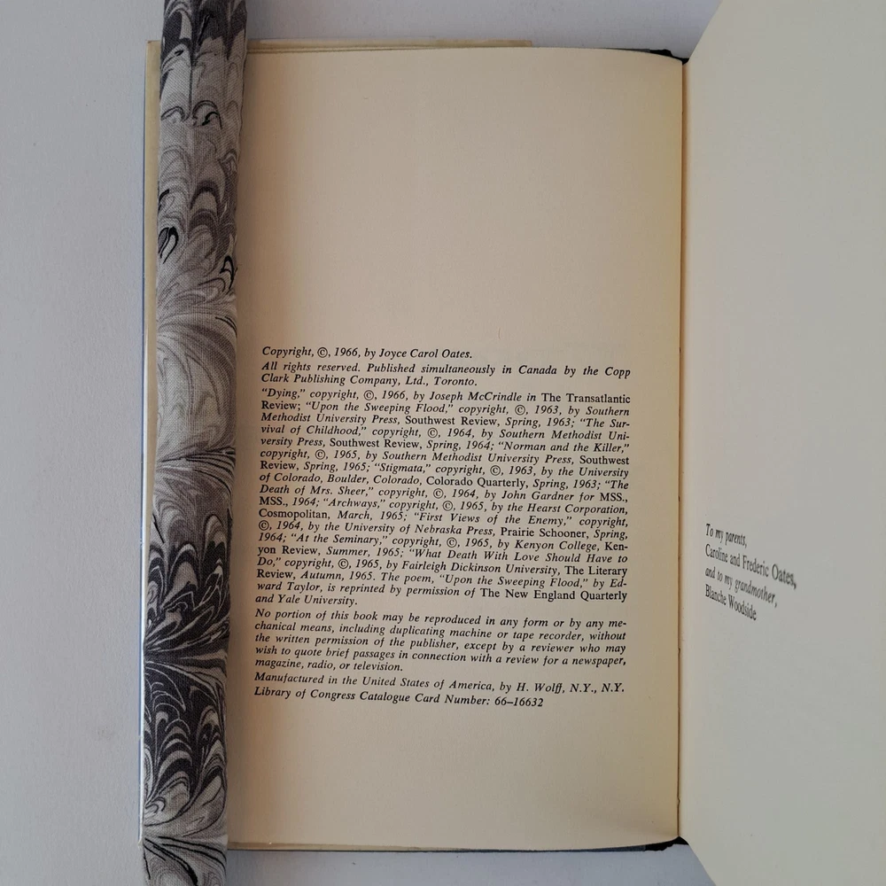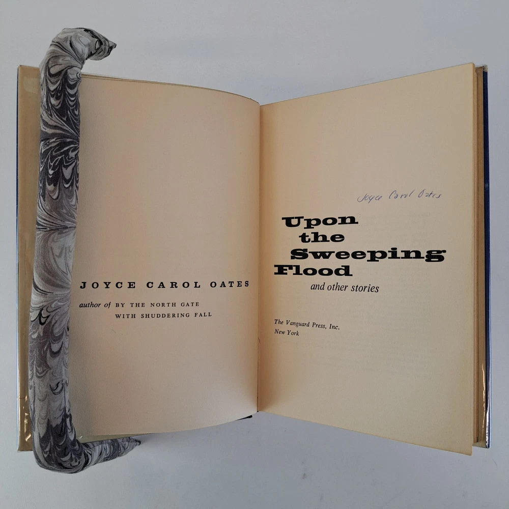 UPON THE SWEEPING FLOOD [Signed] Author: Oats, Joyce Carol Title: UPON THE SWEEPING FLOOD [Signed] Publication: New York, NY: The Vanguard Press, 1966 Edition: First Edition Description: Octavo, 250 pages. In Very Good condition with a Very Good minus condition dust jacket. Blue spine with white lettering. Dust jacket is wrapped in a mylar covering, price uncut "$4.95", has small tears and mild chipping along most extremities, stains along the flaps, and mild shelving wear. Boards have mild bending wear along the spine head and tail edges and fore corners, and mild age toning along the edges. Textblock has an ink stain on the front pastedown page and an inscription to a previous owner on the front end-page, light soiling along the tail edges, and mild shelving wear along the edges. Signed flat by Carol Joyce Oats on the title page. Shelved in Room C. NOTES Presumed First Printing. However cannot confirm because The Vanguard Press sometimes failed to note subsequent printings. Seller ID: 1392832 Subject: Literature Welcome to the eBay store of Second Story Books! DC's Oldest Rare and Used Bookstore, Second Story Books operates two open shops in the Washington D.C. metropolitan area. We have an extensive internet presence and provide accredited appraisals member ASA. This listing was created by Bibliopolis.