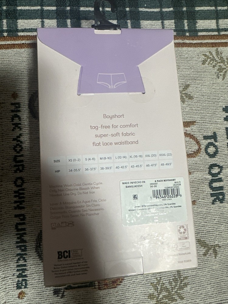 This Joyspun 6-pack of women's boyshort underwear panties is crafted from a cotton blend material with a lace fabric type, offering a comfortable and stylish option for everyday wear. The panties feature a mid-rise fit in size 2XL, suitable for size 20. They come in a multicolor pattern with tagless design and lace waist for added comfort. These opaque panties are machine washable and provide a classic yet modern look, making them a practical addition to any woman's intimates collection.