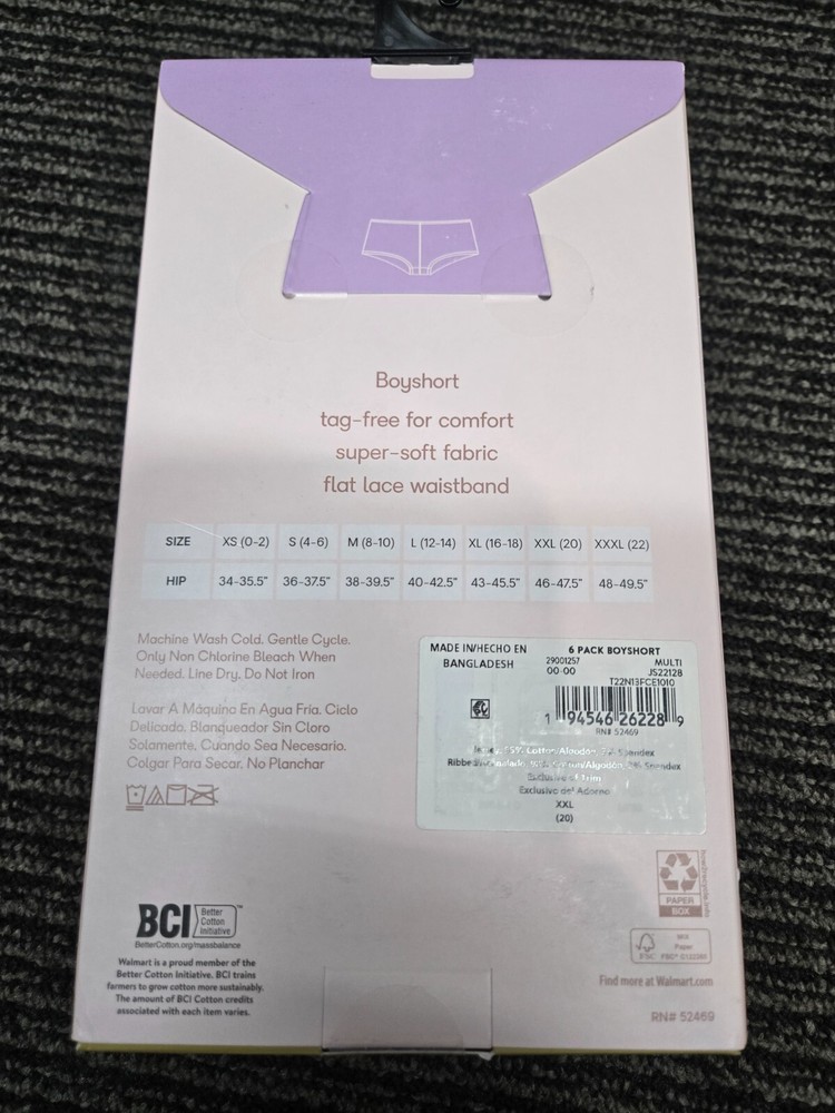 This Joyspun 6-Pair Women's Boyshorts Underwear Panties are made of a comfortable Cotton Blend material with a lace waist detail. They are size 2XL (20) and come in a multicolor pack with various patterns. These mid-rise panties feature a tagless design for added comfort and are machine washable for easy care. Perfect for everyday wear, these opaque boyshorts offer a flattering fit and are a stylish addition to any woman's intimates collection.