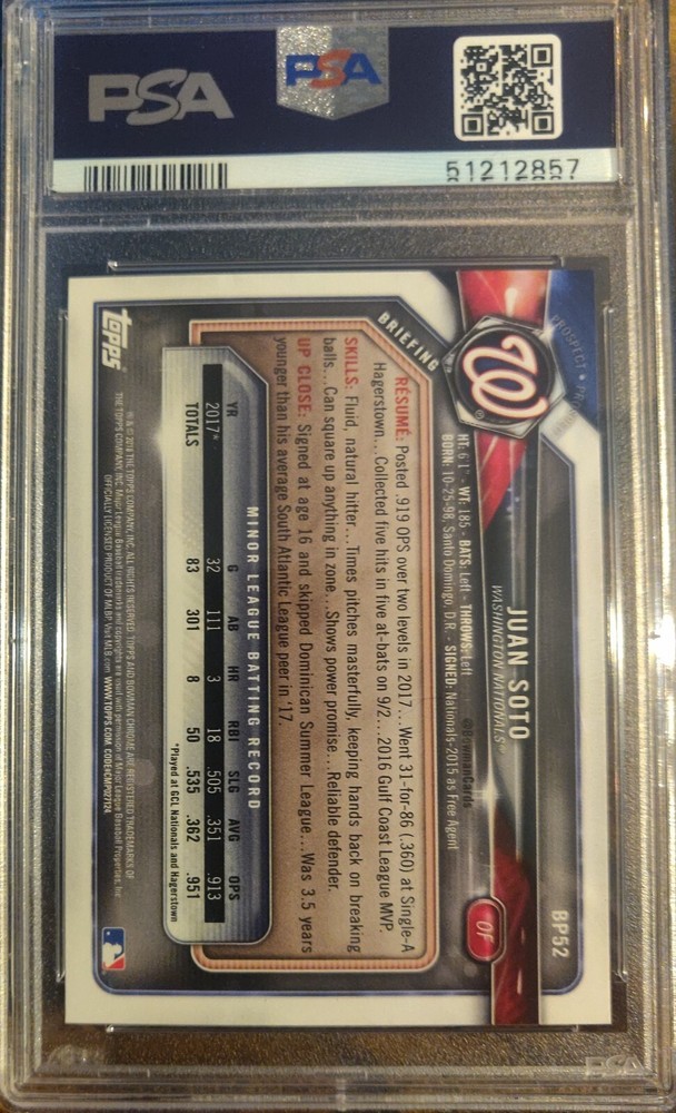 Juan Soto 2018 Bowman Prospects Rookie Card BP52 PSA 10 GEM MINT