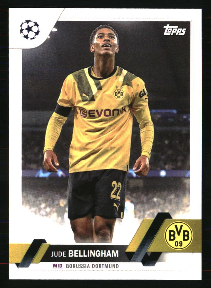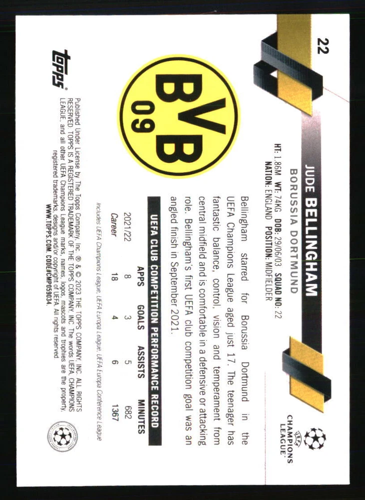 Card Number: 22 Manufacturer: Topps Autographed: No Season: 2022 Sport: SOCCER Year Manufactured: 2022 Team: Borussia Dortmund Set: 2022-23 Topps UEFA Club Competitions Carnaval Edition Graded: No Type: Sports Trading Card Player|Athlete: Jude Bellingham