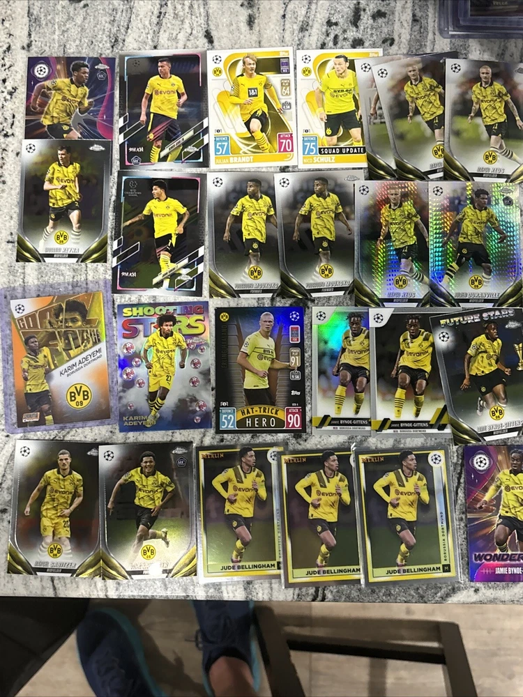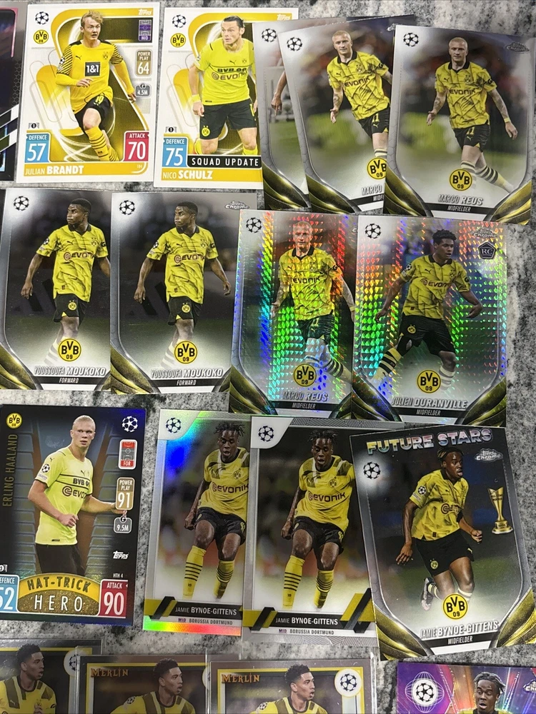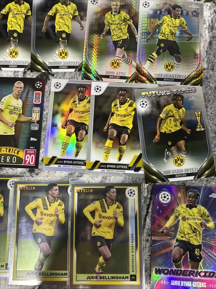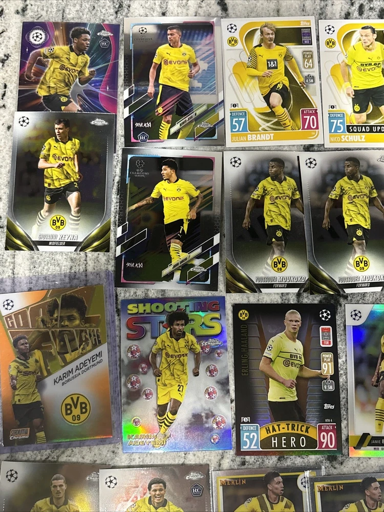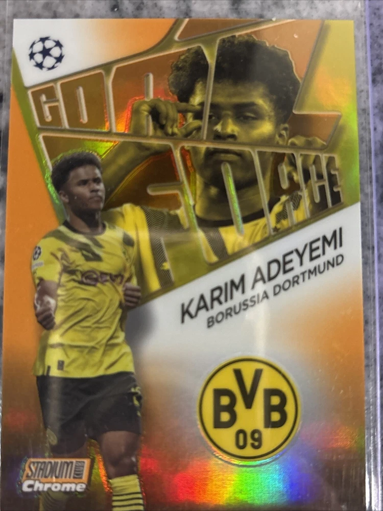 This lot of 25 sports trading cards features players from Borussia Dortmund, including Giovanni Reyna, Jude Bellingham, and Erling Haaland. The cards are from the 2023 Topps Stadium Club Chrome, Match Attax, and 2023 Topps Merlin sets, and were manufactured by Merlin in 2024. Fans of soccer and the UEFA Champions League will love this collection, which includes cards from the 2021-22 season. Whether you're a collector or a fan of Dortmund, this lot is a must-have. These trading cards are a great addition to any collection, and feature some of the most exciting players in soccer. Don't miss out on the chance to own these cards from the 2023 Topps Stadium Club Chrome, Match Attax, and 2023 Topps Merlin sets. Adeymi Stadium Club Chrome Goal Force 18/25.