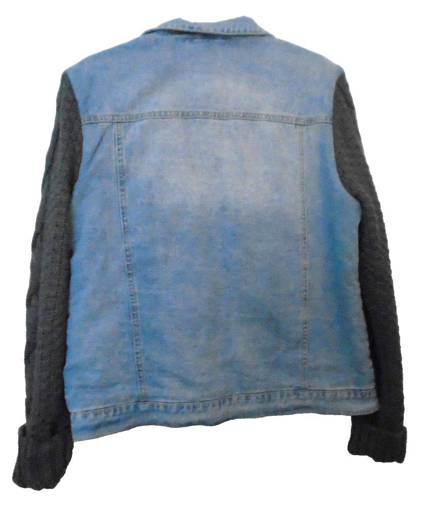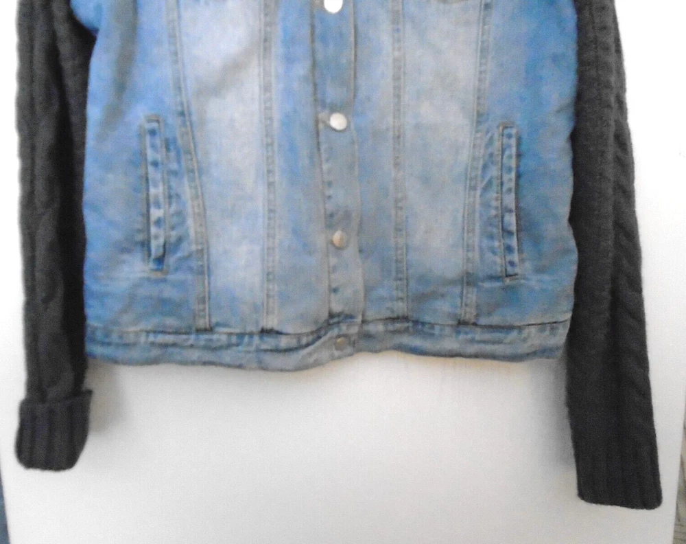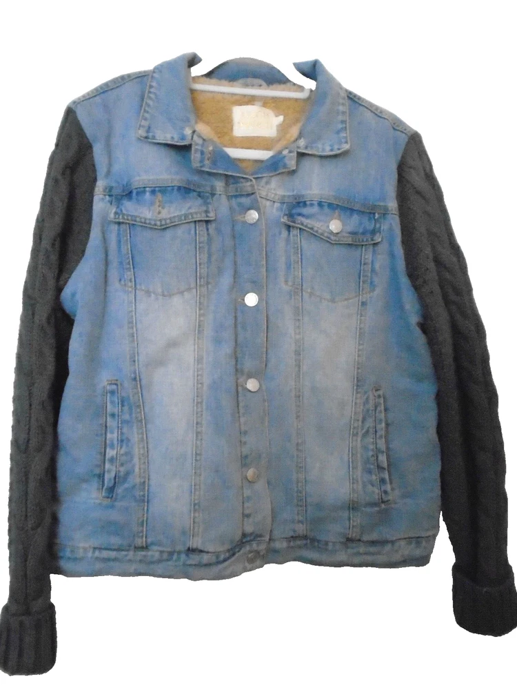 This stylish women's jacket from Judith Marsh is perfect for any occasion. The outer shell is made of 100% cotton denim and grey cable sweater sleeves, making it a colorful addition to your wardrobe. The jacket features a button closure, long sleeves, and pockets for added functionality. Faux fleece lying for warmth It is available in size Large and is suitable for winter, fall, and spring seasons. This basic jacket is perfect for travel, party/,and casual, occasions. It's machine washable and easy to care for. Judith Marsh Vintage Womens Sz L Jean Jacket Fleece Lined and Sweater Sleeves Actual Measurements lying flat Back of neck to hem 25" Bustline pit to pit 20" so approx 40" measurements from the outside 31/sav15