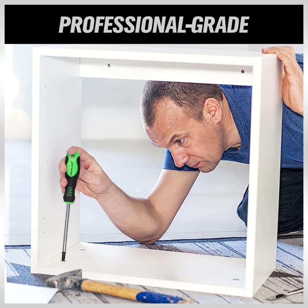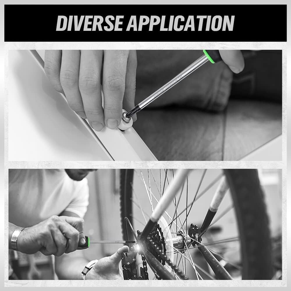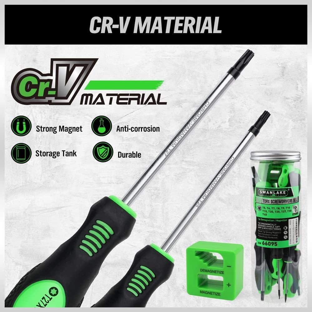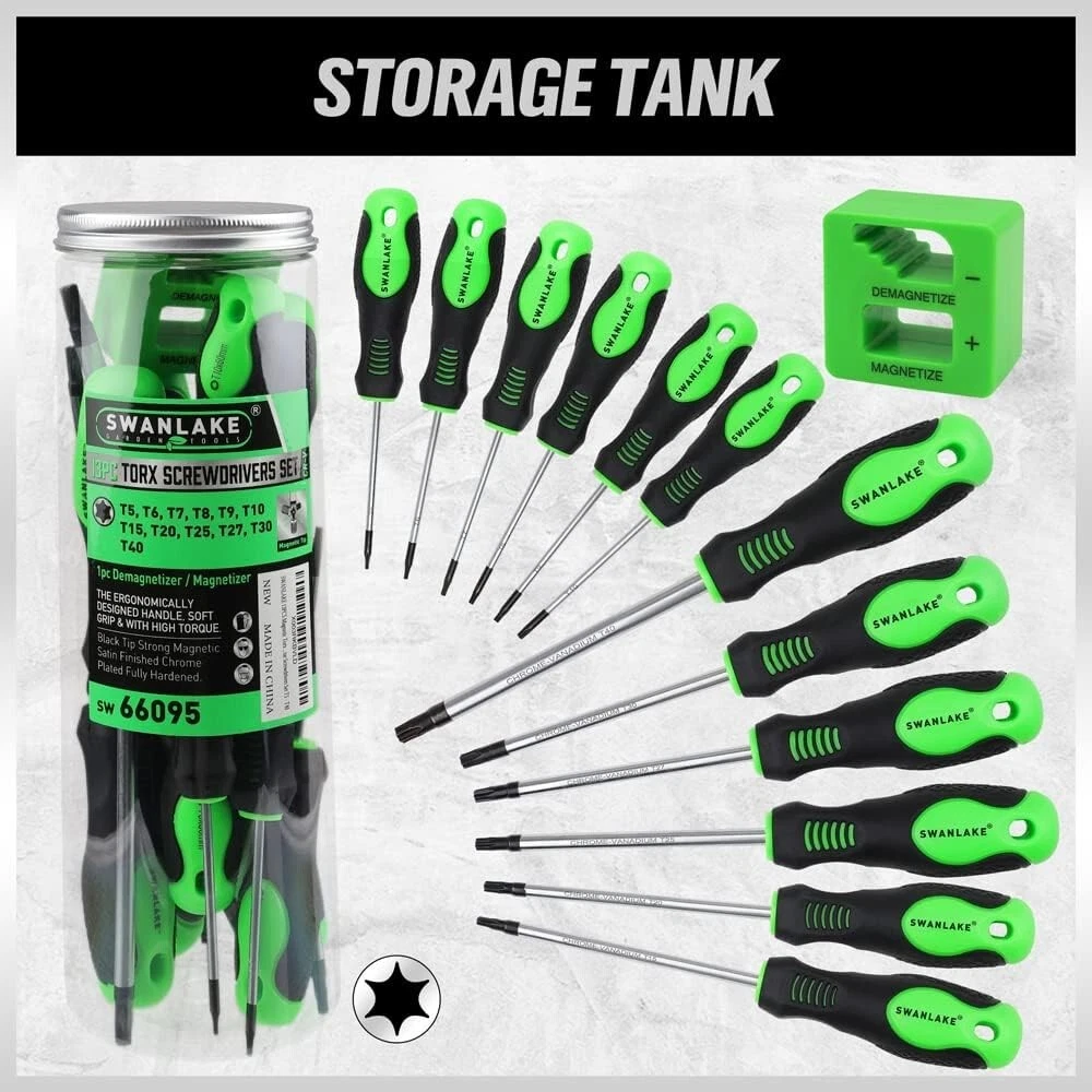 Made of Chrome vanadium steel with heat treatment,high hardness, large torque, long service life. Cushion grip handle for comfort and control,With ergonomic TPR handle and button on it, it helps you to use easily. Black finish blade with magnetic tips which could conveniently attracts screws. Set Includes: T5 x2-1/2", T6 x2-1/2", T7 x 2-1/2", T8 x 2-1/2", T9 x 2-1/2", T10 x 2-1/2", T15 x 4", T20 x 4", T25 x 4", T27 x 4", T30 x 4", T40 x 5"and a magnetic retriever . Widely used for maintenance and assembly of all kinds of mechanical equipment ,domestic appliances and furniture.
