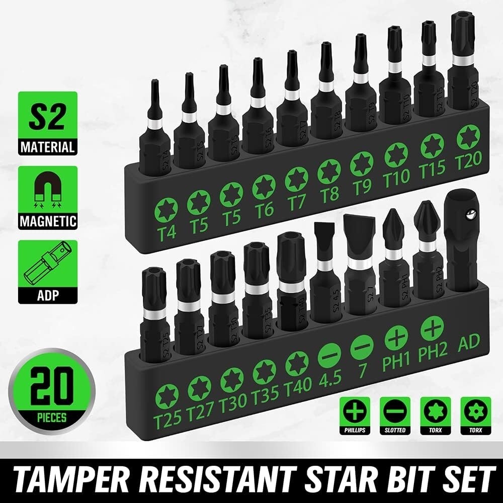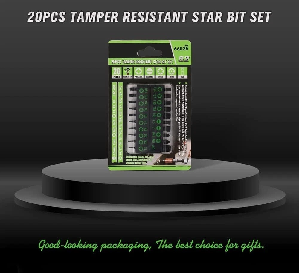 Juego De Puntas Torx De Seguridad Magnéticas Para Taladro Impacto T4-T40 20 PCS. 1. Puntas de acero de aleación S2 de grado industrial, con una construcción robusta endurecida y templada, resistencia total al óxido y la corrosión. 2. Este juego de 20 puntas de destornillador incluye 15 puntas de estrella a prueba de manipulaciones, puntas Phillips PH1 PH2, puntas ranuradas de 4,5 mm y 7 mm y un conector AD. 3. El juego de puntas de estrella a prueba de manipulaciones son: T-4, T5, T5, T-6, T-7, T-8, T-9, T-10, T-15, T-20, T-25, T-27, T-30, T-35, T-40, con estuche de almacenamiento negro. 4. Inserte suavemente con extremos de broca biselados de precisión. Los tamaños están estampados en las puntas e impresos en verde en el organizador de almacenamiento para un reconocimiento más rápido. 5. Diferentes tipos de brocas satisfacen sus necesidades más diarias. Se utilizan en automóviles, reparaciones, camiones, automóviles, motores, motocicletas, interiores, tableros, computadoras, decodificadores, juguetes, electrodomésticos y productos electrónicos de consumo.