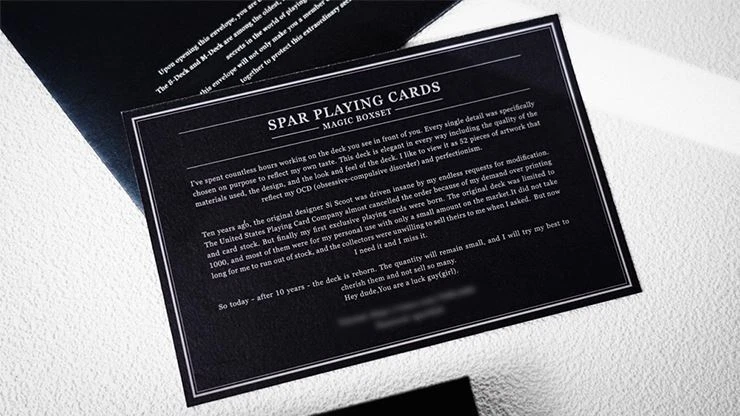 Please note: We only sell genuine playing cards from bonafide manufacturers. I've spent countless hours working on the playing cards you are about to see. Every single detail is the best in my opinion: the card stock, feel, design, and taste. This was not merely a deck of cards, but 52 cards born out of obsession (OCD) and perfectionism. Ten years ago, the designer Si Scott was driven insane by my endless requests for modification. The United States Playing Card Company almost canceled the order because of my demand over the printing and card stock. Finally, my first exclusive playing card was born. The original version is limited to 1000 decks, most of them are for my personal use, with only a small amount on the market. It did not take long for me to run out of all my stock, and the collectors were unwilling to sell it to me... I need it, and I miss it. Today - after 10 years after its release, I have brought it back to life. The quantity is still small, and I will try my best to cherish them and not sell so many... SPAR Standard Box Set : Includes a set of red and blue SPAR Playing Card decks. Classic red and blue. These decks of cards, like keys, unlock the treasure buried in one's hands. The moment you handle these cards, you start envisioning a performance, even if the audience is just yourself. The blue edition features a marking system, allowing for various card effects in one deck. The charm of magic can be elegant, while also capable of being simple simultaneously. The blue deck also harbors a super-secret feature. This could well be the first-ever fusion of marked cards and stripper cards in history. Now, It's a time to witness a miracle! ____________________________________________________________________________________________ Are you ready to elevate your poker game with original playing cards? Visit our store today to browse our selection of authentic decks and start playing like a pro. Remember, when it comes to poker and other card games, we only sell original cards from genuine sources. Experience the difference for yourself and take your gameplay to new heights with premium quality playing cards.