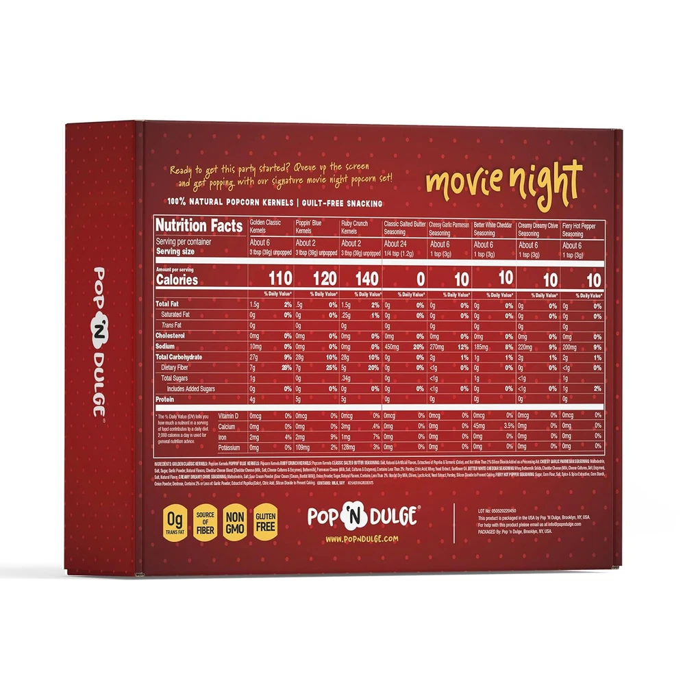 VALENTINES DAY MOVIE NIGHT POPCORN KIT: It just takes a little imagination to recreate the romance of your favorite theater at home. Cuddle up with someone special or invite your best buddies over to pop some delicious movie popcorn for a Valentine’s Day movie marathon. Make your favorite flavors, mix and match, and get creative with the best of all foodie gifts and Valentine’s Day gifts for friends. 5 DELICIOUS POPCORN FLAVORS: Make movie magic with 5 mouth-watering, savory popcorn seasonings: Classic Salted Butter, Cheesy Garlic Parmesan, Better White Cheddar, Creamy Dreamy Chive, and Fiery Hot Pepper. Our Valentine’s Day Movie Night Popcorn Set makes it easy to whip up a crunchy cinematic snack in no time. This popcorn seasoning variety pack is the best of all valentine gifts. PACKED WITH FUN: Enjoy gourmet kernels in three different, natural earth tones: Golden Classic, Poppin’ Blue, and Ruby Crunch. Our Valentine’s Day Movie Night Popcorn Gift Set is sourced with the highest quality ingredients in mind. Whether you’re looking for memorable Valentine’s Day gifts for mom, I love you gifts for her, girlfriend gifts, or wife gifts, there’s something for everyone in this tasty popcorn variety pack. A GREAT GIFT: Looking for cute Valentines Day gifts for her? This gourmet, popcorn gift is an exciting way to set the stage — for a fun-filled girls’ night, a romantic couples evening, or a cozy family movie night, wife valentines day gifts, family gifts, foodie gifts. This Valentines Day gift box is a truly thoughtful way to say “I love you.” and a great way to transform an ordinary evening into something special. ALL NATURAL, NON-GMO KERNELS: We care about the quality of our products, because your health matters. That’s why a whole lot of effort goes into ensuring that our food kits contain only the best ingredients and products out there. All our kernels and spices are naturally gluten free, non-GMO, free from trans fats, and sourced from farms in the USA. Get ready for guilt-free snacking! Product Description Pop 'N Dulge Movie Night Popcorn Gift Sets Add to Cart Add to Cart Add to Cart Add to Cart Add to Cart Add to Cart Customer Reviews 4.5 out of 5 stars 2,735 4.7 out of 5 stars 62 3.8 out of 5 stars 18 4.5 out of 5 stars 56 4.4 out of 5 stars 959 4.4 out of 5 stars 959 4.3 out of 5 stars 112 Price $24.98 $ 24 . 98 — $12.98 $ 12 . 98 $21.95 $ 21 . 95 $24.95 $ 24 . 95 — $21.98 $ 21 . 98 Items included 16 20 1 10 10 10 5 Giftable Packaging ✔ ✔ ✔ ✔ ✔ ✔ ✔ Greeting Card ✔ ✘ ✘ ✔ ✔ ✔ ✘ Kosher ✔ ✔ ✔ ✔ ✔ ✔ ✔ Made in USA ✔ ✔ ✔ ✔ ✔ ✔ ✔