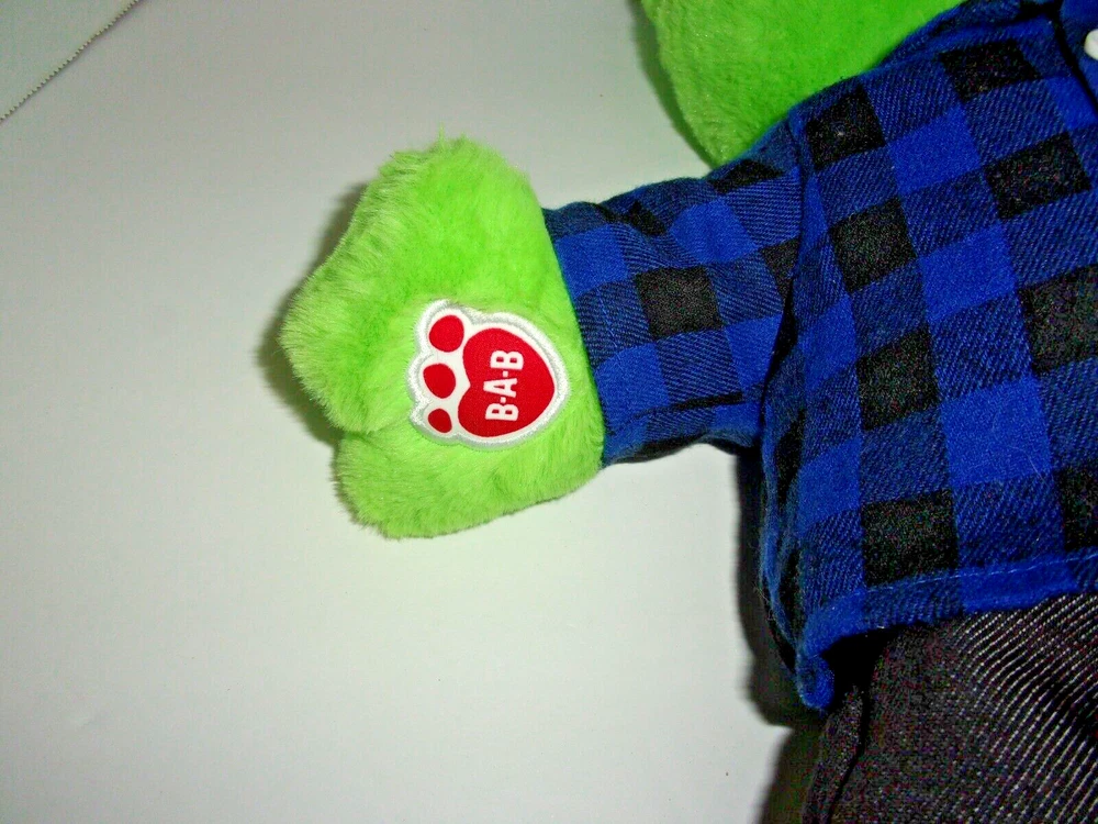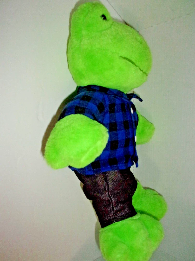 Build A Bear Green Frog Plush Toy Dressed in plaid shirt & Jeans approx 17" high