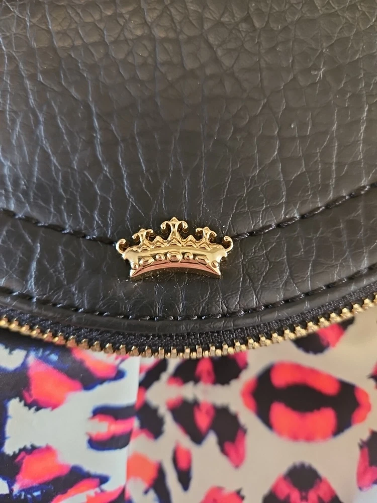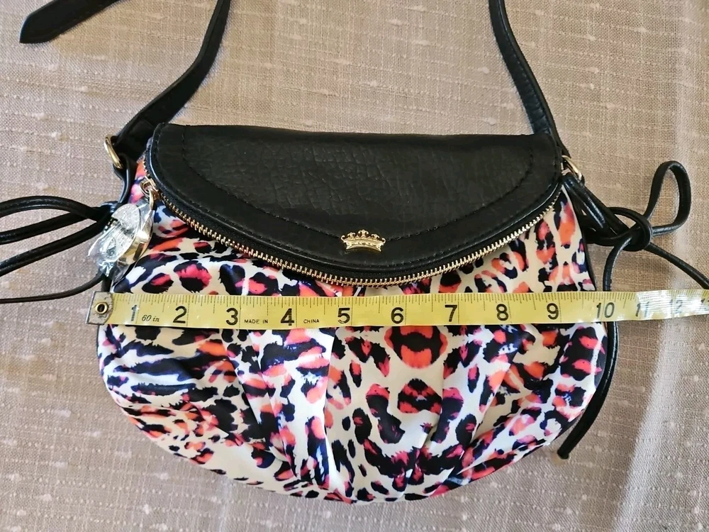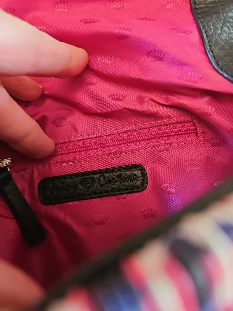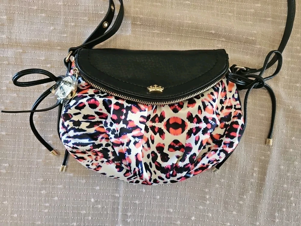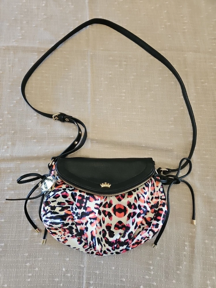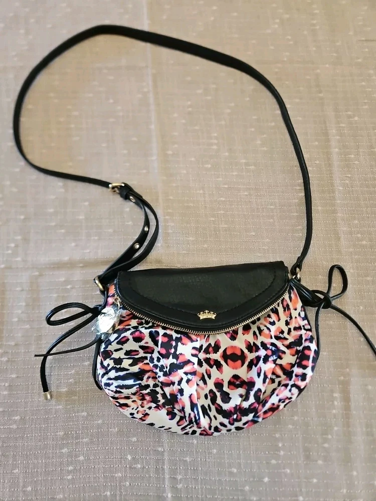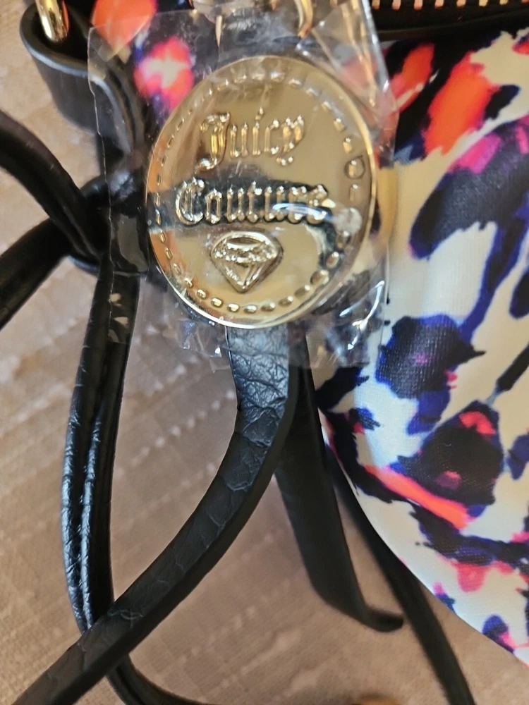 Juicy Couture bag lips print white black pink with faux leather and fabric body of the purse Crossbody with nice bow details gold Hardware. Color may vary from pictures. Measurements are approximate as seen in pictures. International shipping could have extra taxes and or fees. Please let me know if you have any questions.