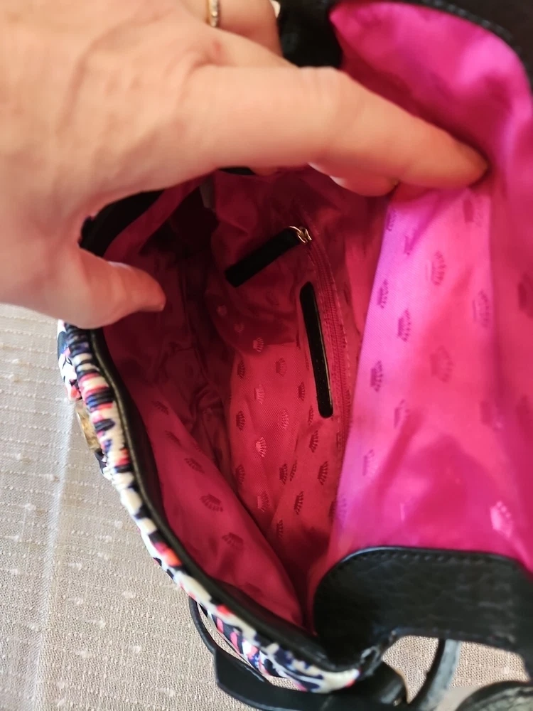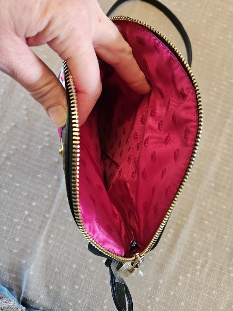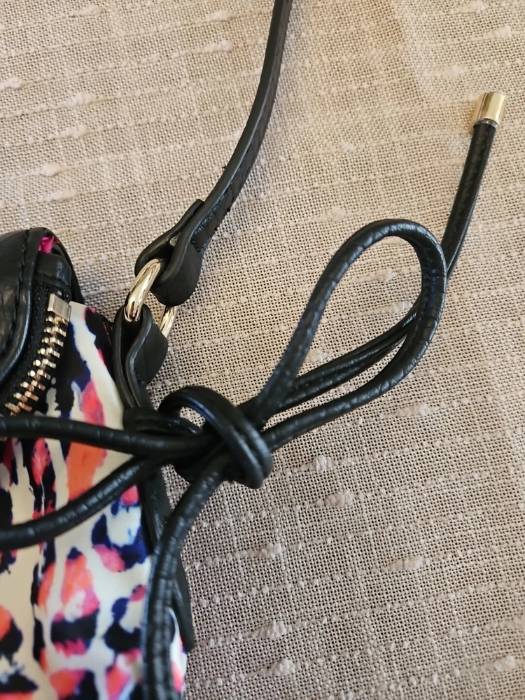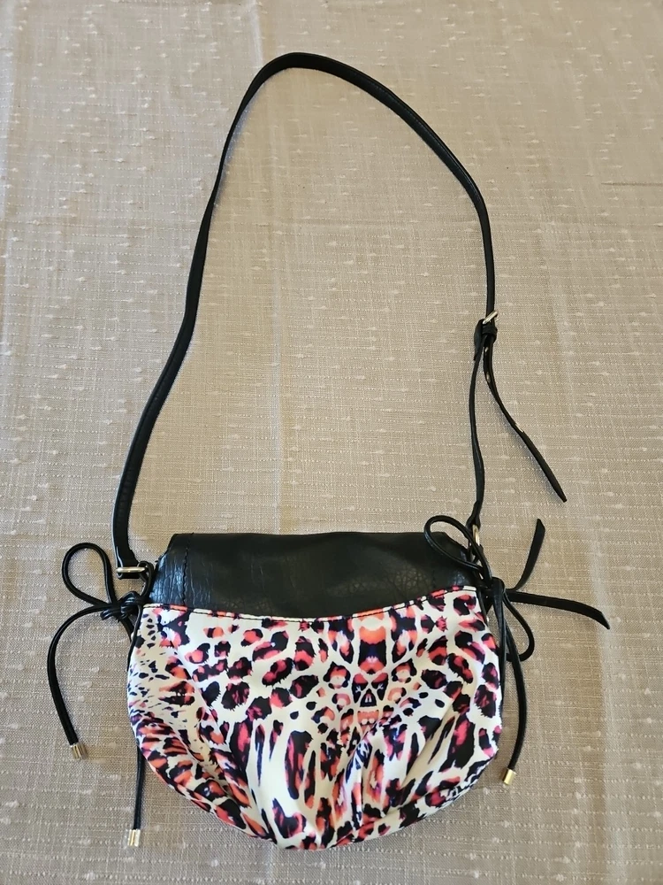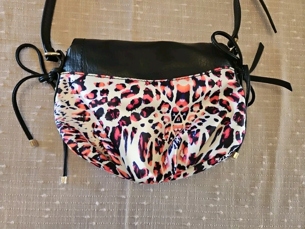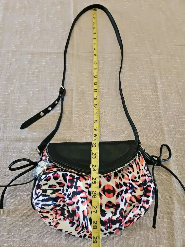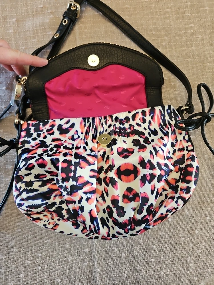 Juicy Couture bag lips print white black pink with faux leather and fabric body of the purse Crossbody with nice bow details gold Hardware. Color may vary from pictures. Measurements are approximate as seen in pictures. International shipping could have extra taxes and or fees. Please let me know if you have any questions.