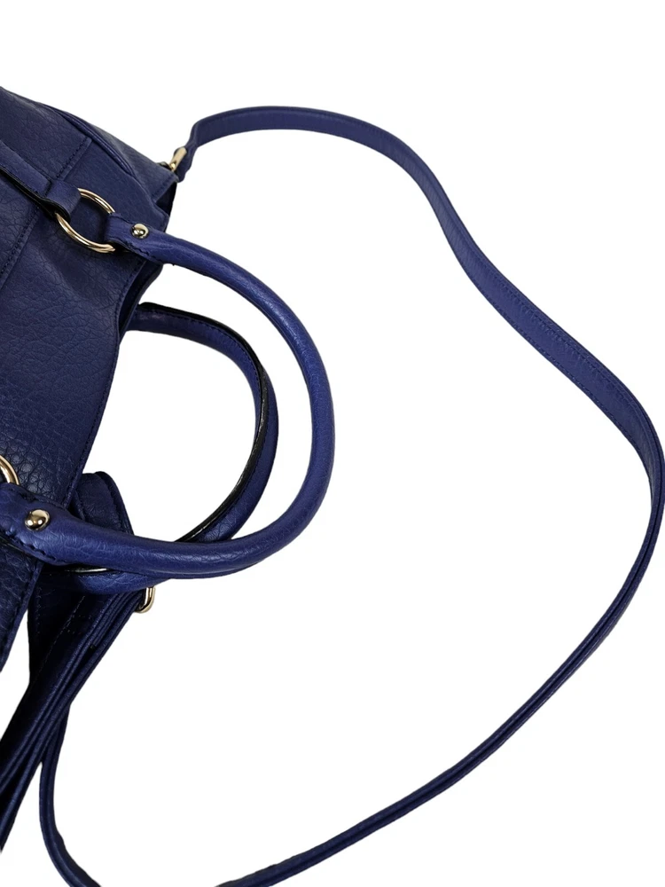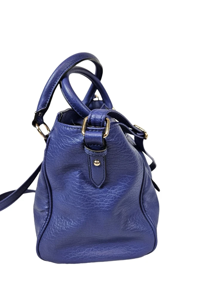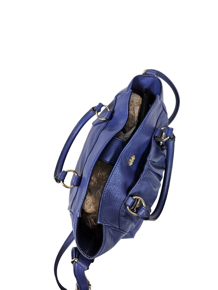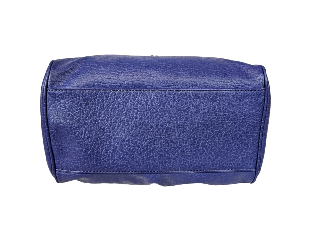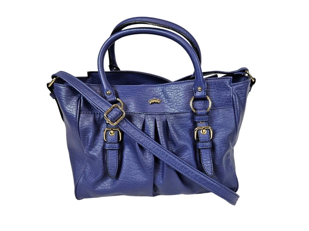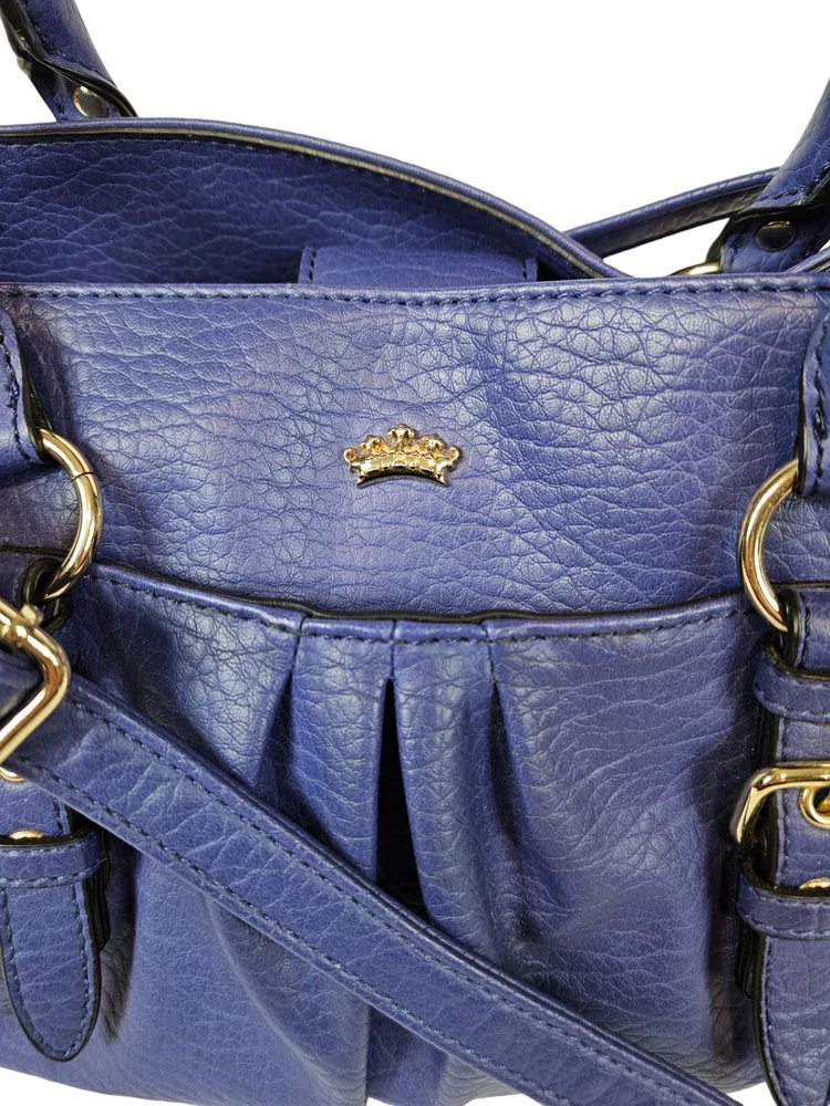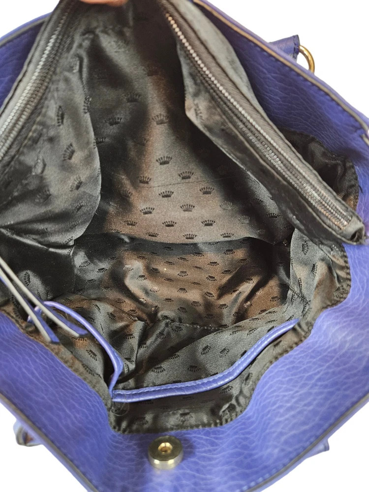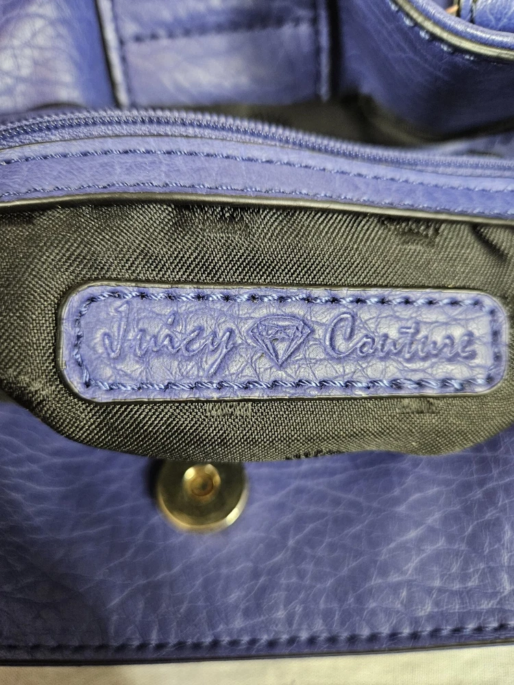 Juicy Couture Blue Purple Faux Leather Satchel Medium Bag Women's Purse Handbag In excellent condition Juicy Couture Blue Purple Faux Leather Satchel Medium Bag Women's Purse Handbag. Throw this stylish Juicy Couture crossbody over your shoulder or use the double arm straps for a fashionable look and iconic flair. Features blue purple faux leather, Juicy Couture satchel purse, shoulder strap with gold chain accents, magnetic snap closure, gold Juicy Couture crown logo and J logo, exterior front slip pocket, Interior: large middle zipper pocket and 2 large compartments with 2 multifunctional pockets and a zipper pocket, pleated accents, Flap front with gold zipper and additional large compartment. Measurements height 8.5" length 9.5" depth 6.5" short strap drop 4" long strap drop 22" Fabric faux leather This is a pre-owned item that may show signs of wear. In excellent condition, no flaws.