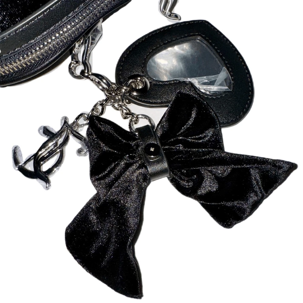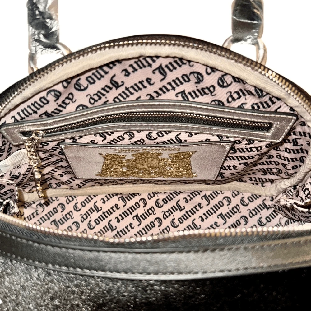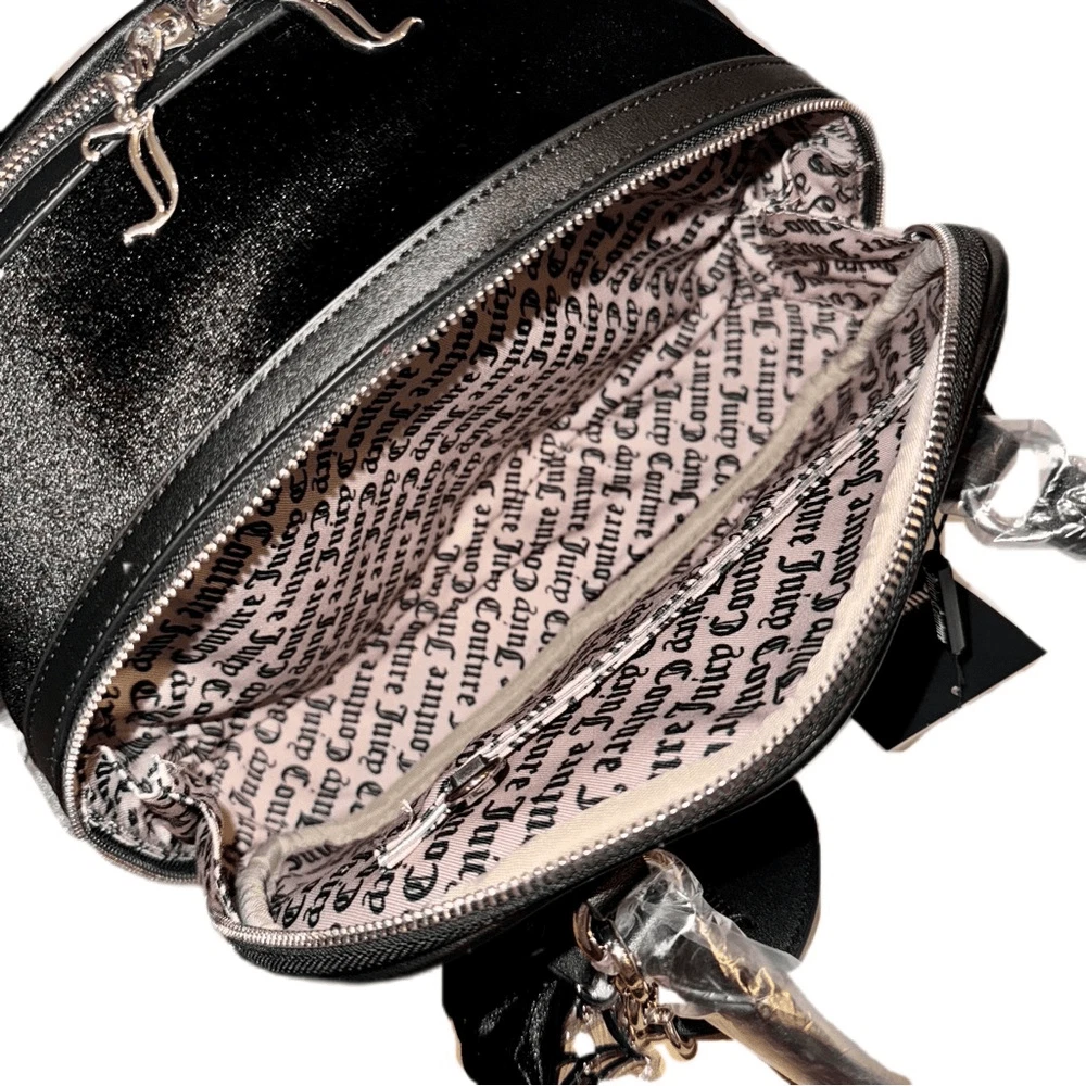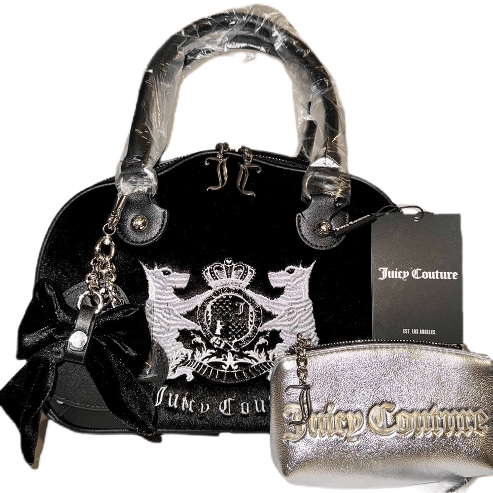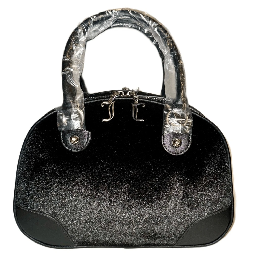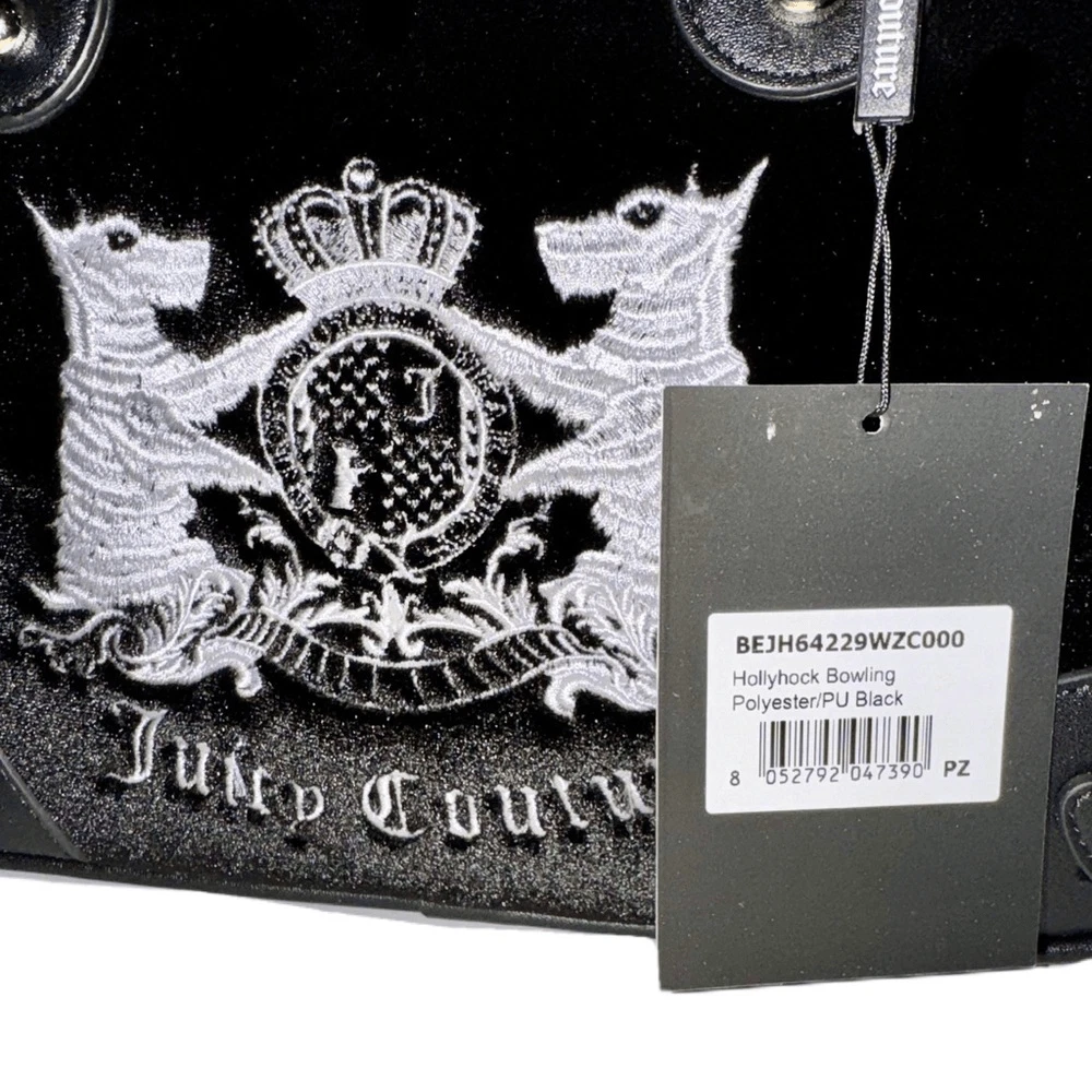 NWT - Juicy Couture Hollyhock Bowling Satchel Bag in Black Velour and Faux Leather. Shaped to a bowling bag-inspired silhouette that features 2 roomy compartments, topped with twin handles and stitched with the iconic Scotty Dog branded embroidery at the front. Very reminiscent of the Y2K era style of velour Juicy bags. Gorgeous with so much attention to detail. BRAND NEW, never been used, flawless condition. Offers welcome! •Black Velour & Faux Leather Exterior •Scotty Dog Logo Embroidery •Dual Top Carry Handles (4.72” drop) •Removable & Adjustable Shoulder Strap •2 Double Zipper Compartments •Polished Silver-Tone Hardware •Logo Print Fabric Lined Interior •2 Slip & 1 Zip-Close Pockets •Detachable 🖤 Mirror, Bow, & Keychain •Removable Mini Pouch •Measures 11.42”W x 8.66”H x 5.91”D •Includes Original Dust Bag