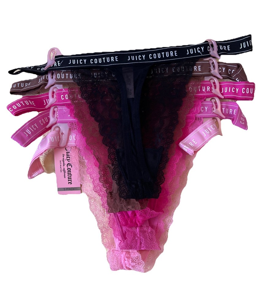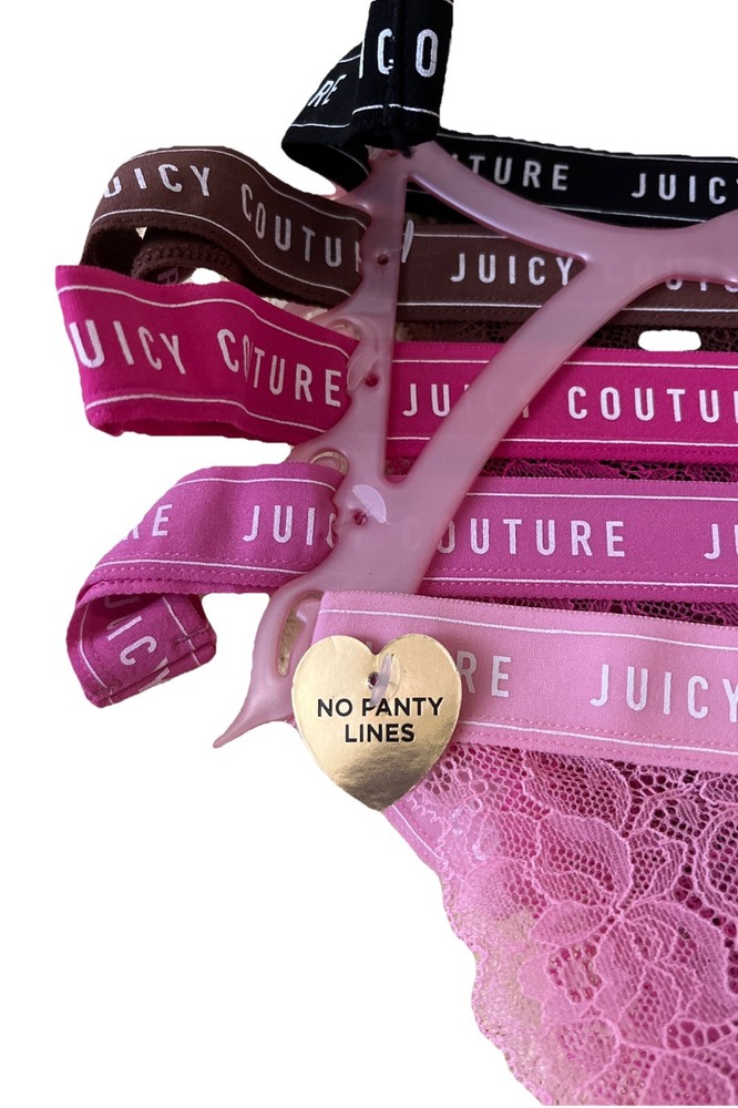 Add a touch of femininity to your lingerie drawer with this gorgeous set of Juicy Couture thongs in petal pink powder pink. Made with lightweight and stretchy lace fabric, these thongs are breathable, sheer and perfect for everyday wear. The pack includes 5 thongs, all in size XL, and they are perfect for women who love the thong/string style. These panties are a must-have for any woman who wants to feel comfortable and stylish at the same time. The brand Juicy Couture is known for its quality and design, and these thongs are no exception. The pink color and lace fabric make them perfect for any occasion, whether you're going to a party or just lounging at home. Don't miss the chance to add these beautiful thongs to your collection!