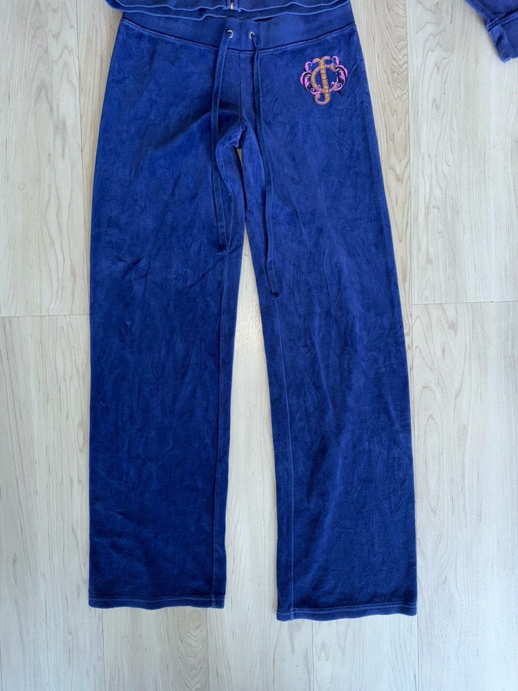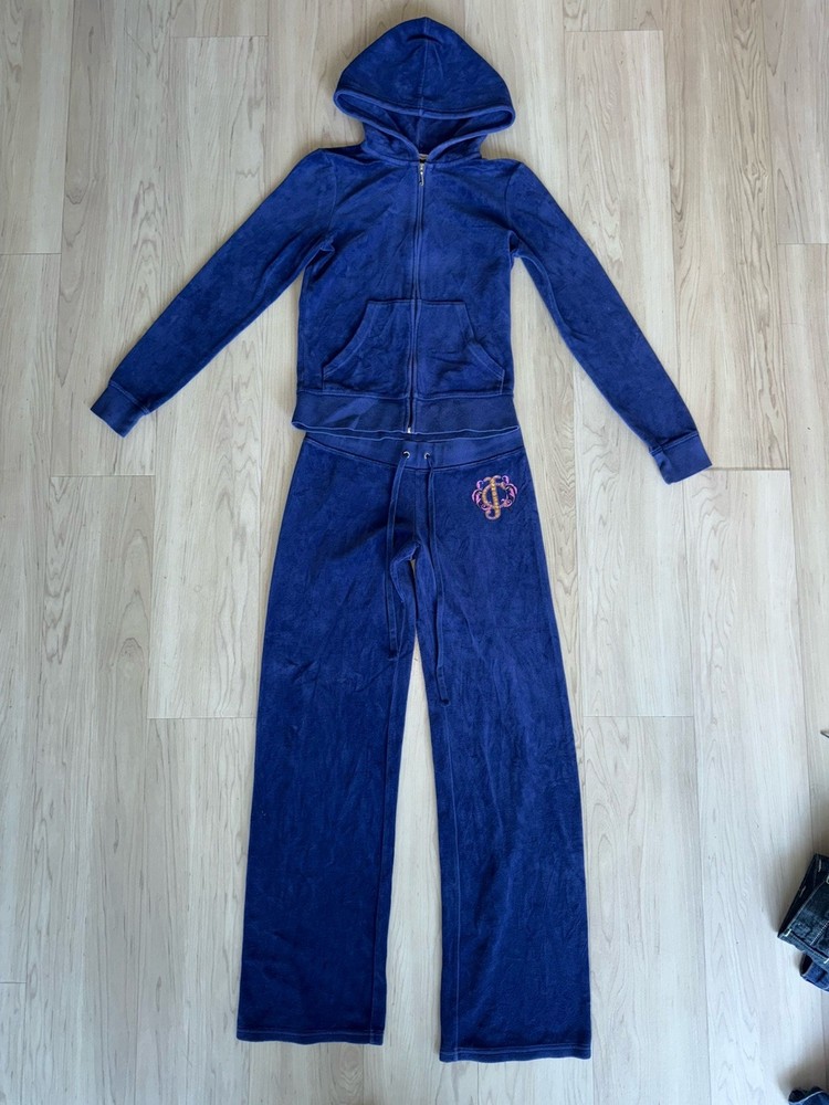 The Juicy Couture Women's Tracksuit from the 2000s in size S is a rare vintage find in a striking purple and blue color. Made of polyester velour, this 2-piece set features a solid pattern, long sleeves, and a zip closure for a comfortable fit. Perfect for activewear occasions, this tracksuit includes pockets for added convenience. Ideal for winter, fall, and spring seasons, it is a stylish and cozy choice for women looking to add a retro touch to their wardrobe.