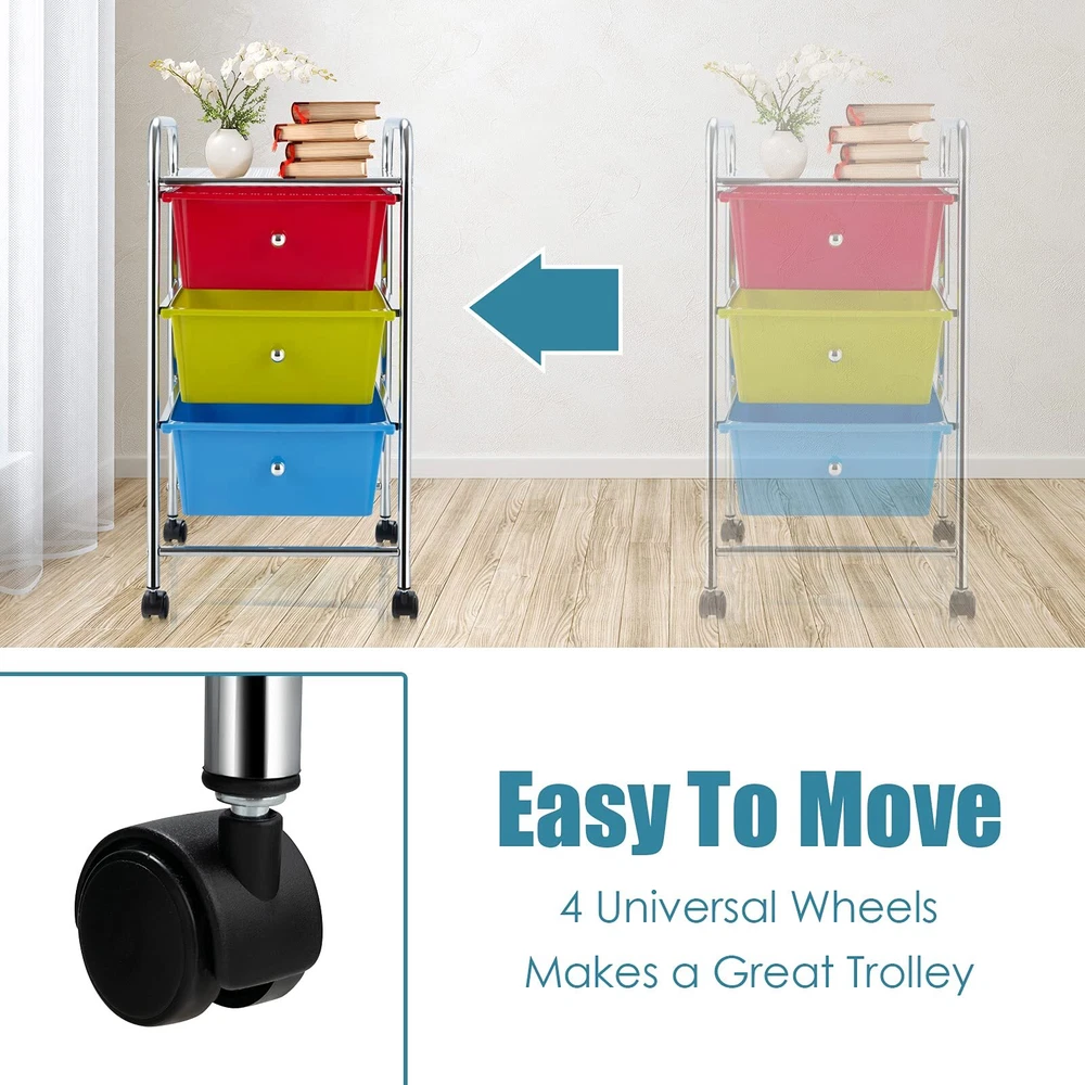 Product DescriptionDescription: Are your room all in a mess? The compact rolling storage cart with 3 drawers is perfect for your office, home, school or kitchen. The utility cart features a chrome steel frame and plastic drawers for solid construction and durability. 3 large drawers provide plenty of storage space for all your daily necessities, and are a perfect addition to your living space. Besides, equipped with 4 universal wheels, the storage cart is easy to move and secure. Come and buy ! Features: 3 removable drawers for storing and sorting items 4 universal wheels for easy movement Steel frame ensures structural stability of the cart Metal knob for easy opening and closing of drawers Colorful drawers are a decorative addition to your space Perfect storage for home, office, kitchen, etc. Easy to assemble and disassemble with detailed instructions Specifications: Material: Steel + PP Drawer Size: 12" x 9" x 5" (L x W x H) Overall Size: 15.5" x 12.5" x 24.5" (L x W x H) Weight capacity of the steel panel: 16.5 lbs Weight capacity of single drawer: 4.4 lbs Net Weight: 5 lbs Package includes: 1 x 3 Drawers Rolling Cart 1 x Instruction 【3 Drawers Storage Space】: This rolling cart has 3 drawers and each measures 9” x 12” x 5” (L x W x H), providing ample space to and sort your cosmetics, office supplies, tools and more. It keeps your items free from dust and your room neat. Plus, mesh top serves as a perfect desktop for easy access to files or displaying. 【Sturdy Frame & Durable Material】: The storage cart is made of chrome-plated iron, making the cart rust-resistant and corrosion-resistant for long-lasting use. And 3 drawers are made of high-quality plastic, ensuring great load capacity. 【Convenient Knob for Easy Access】Each drawer is equipped with a round knob which brings great convenience to hold. Besides, the space between each drawer allows you to easily open the drawer to get what you need. The smooth surface is easy to clean and maintain, bringing convenience to daily use. 【4 Flexible Wheels】: Our storage trolley has 4 universal wheels that can rotate 360 degrees, which allows you to easily move it anywhere you needed. Moreover, the mute wheels won’t make any noise and can also protect your floor from scratches. And handles on the top of the cart are for easy moving. 【Multifunctional Rolling Cart】: Weighing only 5 lbs, the storage organizer cart is an ideal choice for your workplace, entryway, bathroom, garage, or home to be more organized. Meanwhile, its compact size won’t take up too much floor space, which makes it suitable for corners.