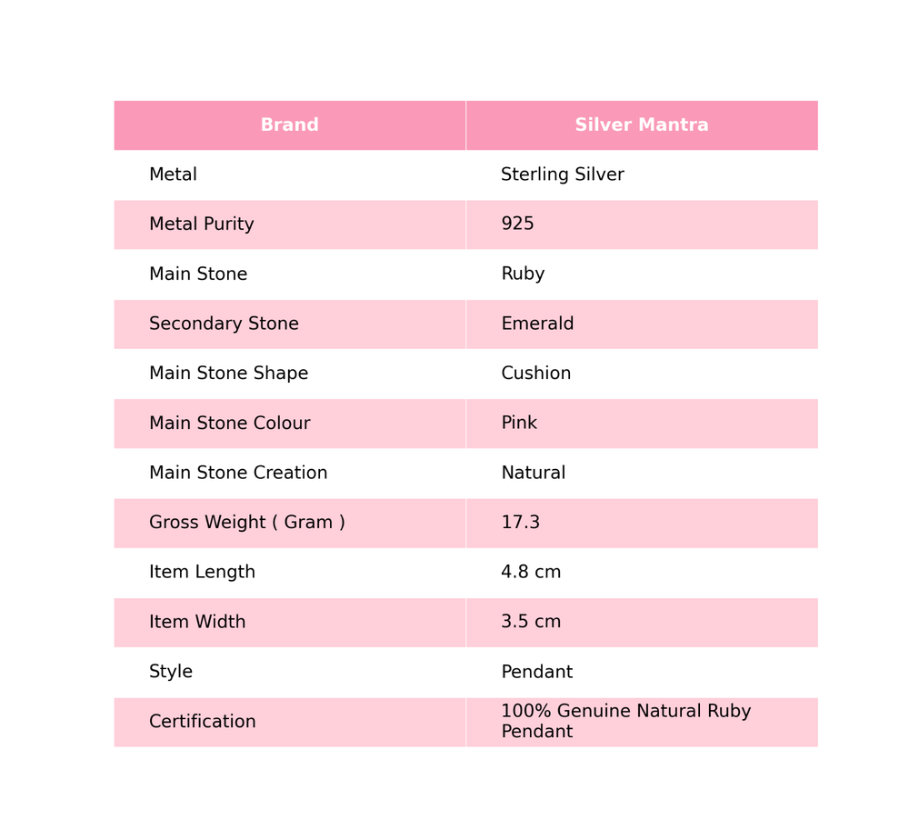 Welcome to Silvermantra2016 July Natural Ruby Solid Silver Bezel Art Deco Engagement Friendship Day Pendant Crafted with the utmost care, this elegant cushion-shaped pendant exudes a timeless charm that is perfect for any occasion, be it an anniversary, birthday, engagement, or wedding. Featuring a stunning pink natural ruby as the centrepiece, it's complemented by eye-clean emeralds that add a touch of luxury. The piece is tastefully set in high-quality silver, ensuring both durability and style. With its exquisite bezel setting and exceptional cut grade, the ruby pendant is a testament to skilled craftsmanship. Designed to be a versatile addition to any jewellery collection, it embodies beauty and sophistication. Whether it's a treat for yourself or a special gift for a friend, this pendant is sure to be cherished. Why silvermantra2016 ? Pure 925 Sterling Silver Jewelry. No alloy and brass nothing. We do not use any type of chemical in our plating process to enhance the shine & luster of the metal which are harmful to your skin. We use high quality stones which gives even better radiance than real gemstones. Customization We offer customization on each product at reasonable price. If you have a design in mind, we can manufacture customized products as well. Gemstone Elegance Choose from a dazzling array of gemstones, including Turquoise, Garnet, Tourmaline, Black Onyx, Tiger Eye, Onyx, Lapis Lazuli, Rainbow Moonstone, Labradorite, Amethyst, Citrine, Cubic Zirconia, Amber, Aquamarine, Rhodochrosite, Amazonite, Aventurine, Azurite, Malachite, Opal, Carnelian, Chalcedony, Chrysoprase, Jasper, Agate, Iolite, Topaz, Larimar, Peridot, Pearl, Prehnite, Ruby, Emerald, Smoky Quartz, Coral, Rutile Quartz and more. Each gemstone boasts unique beauty and energy to enhance your aura. Exquisite Designs Choose from an array of captivating designs, including intricate nature-inspired motifs, timeless classics, and modern interpretations. Our women's gemstone Pendant cater to your unique style preferences. Diverse Gemstone Selection Explore a vast range of gemstones, each connected to specific birth months and symbolic meanings. Versatile Elegance Whether you're dressing up for a special event or elevating your daily attire, our gemstone Pendant effortlessly transition from day to night, ensuring you shine in every moment. Value and Quality As proud manufacturers, we prioritize offering premium women's Sterling Silver Pendant with gemstones at the most affordable prices. Our commitment to value means you can indulge in exceptional jewelry without breaking the bank. ShippingPolicy We do ship worldwide by Registered & Express mail with tracking number. Shipping time takes up to 10 - 14 business days depending on location. All additional payments such as duties & taxes are the buyer's responsibility. We ship only to the approved address that registered in Payoneer. Note: In some cases delay your parcel as per our eBay global shipping partner conveyed us, that shipments may take 25 to 30 days also to reach you due to cross border and customs, delaying clearance of shipments. Note: All Jewelry photos are taken by professional’s photographers. They use many photo equipments, like Flash, Day Light etc. Brightness and contrast are also used in photo editing. So gemstones color can be little dark or light. Handling Time : 2 Business Days Return Policy We Deals in Handmade 925 Sterling Silver Gemstone Jewelry. In any case, if you are not satisfied with the product first, please contact us and we will try to satisfy you by resolving your concern. We only accept returns if product is having any manufacturing defect. If buyer open return request with these reasons like: don't like the item or changed mood, then buyer will have to pay return shipping charges. We didn't accept return of broken piece and stone. If buyer want to return, then return shipping charges will be paid by buyer. Feedback We give immediate positive feedback to our buyers as soon as payment is received in Payoneer. In any case of any problem contact us right away before leaving any Negative or Neutral feedback. We will do our best to resolve any problem and to make you satisfied. Thank you for shopping!