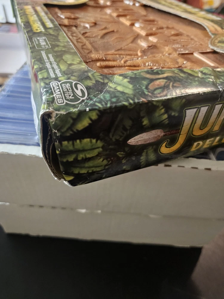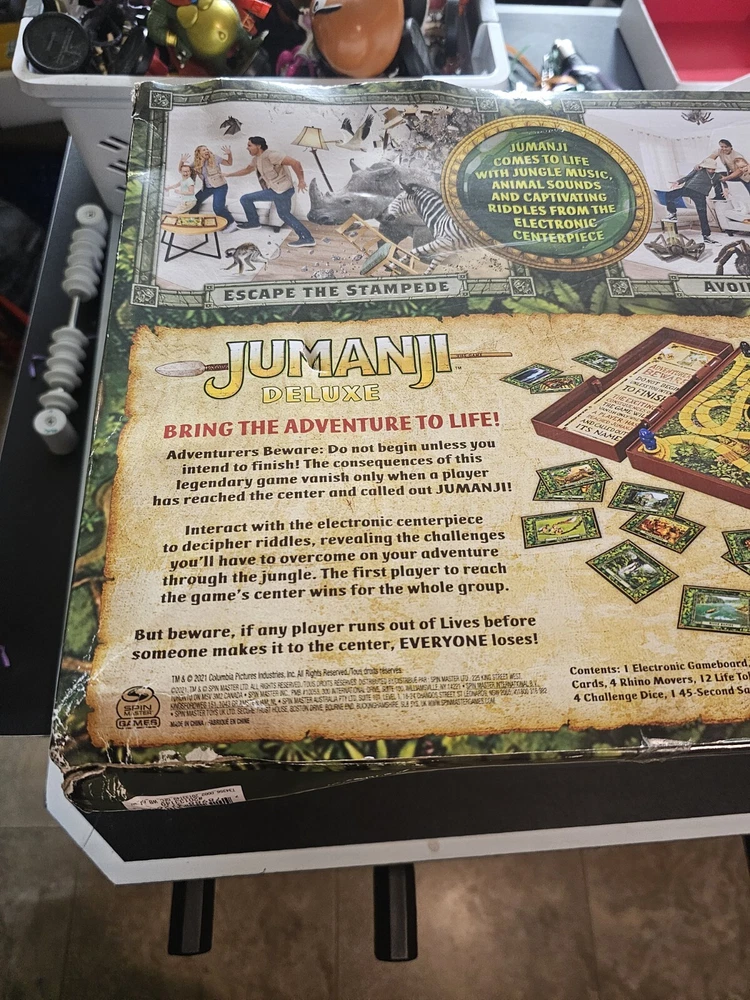 *PLEASE LOOK AT PHOTOS FOR CONDITION OF BOX. THIS IS BRAND NEWBOX ISNT BAD BUT NOT PERFECT. The Jumanji Deluxe Electronic Adventure Game is a board game by Spin Master released in 2021. Designed for 2 players or more, it features automatic/electronic gameplay with lights and sounds. The game is themed around animals and the Jumanji franchise, suitable for boys and girls aged 8 and up. It includes a giant game version and has received the Games 100 award.