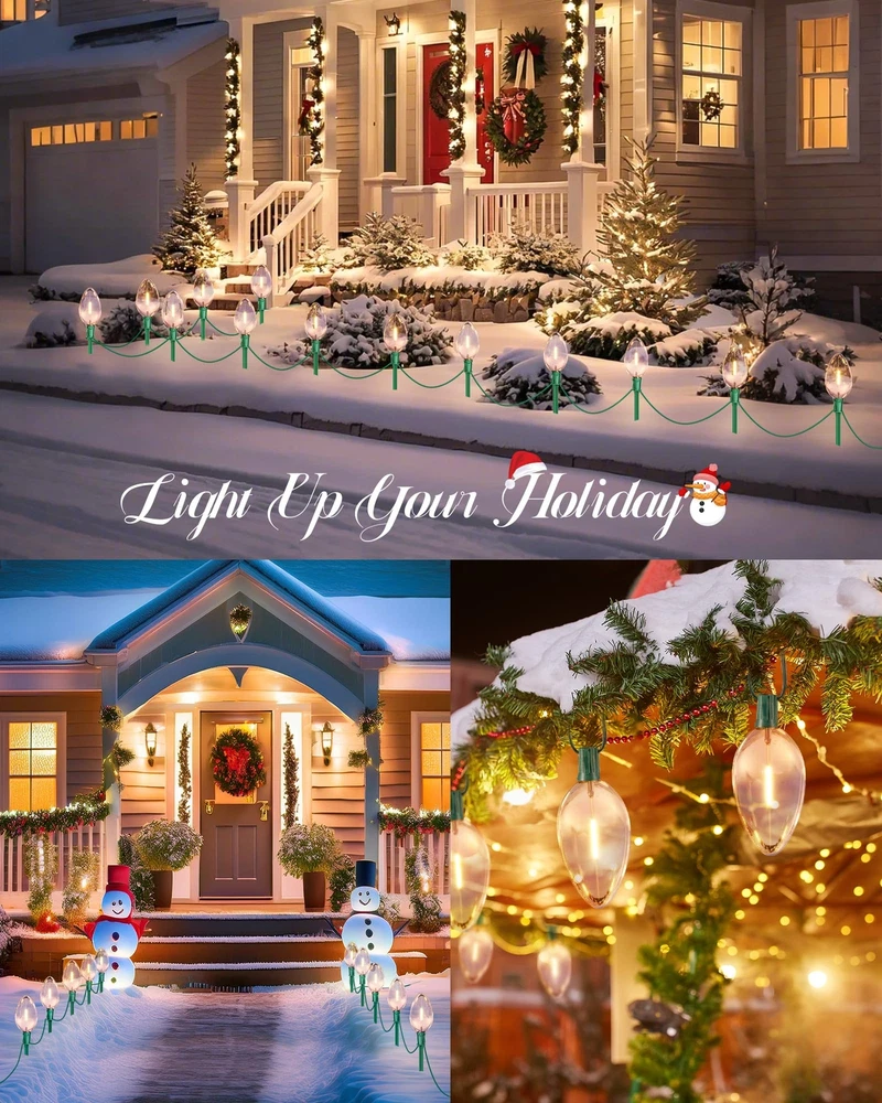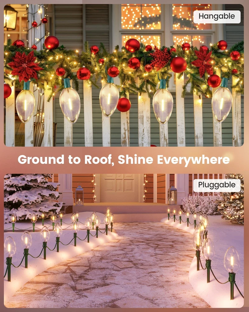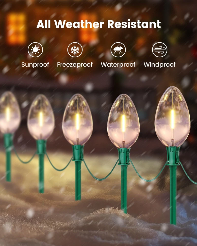 Illuminate your festive season with our Jumbo C9 Christmas Pathway Lights. Stretching an impressive 20 feet, this enchanting display features 10 large, vibrant C9 LED bulbs, each equipped with an E17 base, ensuring a stunning visual impact for any outdoor setting. Our pathway lights are not only a feast for the eyes but also designed for maximum energy efficiency. These warm white lights will transform your driveway, walkway, sidewalk, and yard into a beautifully lit winter wonderland. With a UL Listing for safety and reliability, you can confidently connect up to 72 strands end-to-end, allowing for seamless integration into your existing holiday décor. The package includes 10 sturdy ground stakes, making setup a breeze whether you choose to stake them down or hang them up. Constructed from all-weather resistant PC material, these outdoor lights are built to withstand the elements, making them an ideal choice for Christmas yard decorations and general outdoor Christmas décor. Perfect for decorating houses, roofs, trees, or paths, the Jumbo C9 Christmas Pathway Lights are sure to create a magical holiday atmosphere for your family and friends. Elevate your outdoor Christmas decorations with our Jumbo C9 lights—where size, color, and quality meet to deliver a spectacular festive experience! Vibrant Holiday Glow: Light up your outdoor space with 20FT of Jumbo C9 Christmas pathway lights. Giant warm white LED bulbs are perfect for making your yard, driveway, and walkways festive and welcoming this Christmas Energy-Saving LEDs: The giant Christmas lights are equipped with 10 jumbo C9 LED bulbs, providing bright, eco-friendly lighting, using less electricity so you can enjoy a stunning holiday display without worrying about your energy bill Easy Setup for Christmas Decor: The outside Christmas lights include 10 durable 11.5" ground stakes for fast installation. Whether lining sidewalks, driveways, walkways, or hanging on your roof or trees, setting up your holiday lights is a breeze. Suitable for any Christmas lights with an E17 socket Built for Any Weather: Made with tough PC materials, these Christmas lights outdoor are weather-resistant and built to handle snow, rain, or wind, so your decorations stay bright all season long. These big Christmas lights are perfect for indoor and outdoor use Connect for a Dazzling Display: UL Listed and designed for convenience, you can connect up to 72 strands of driveway Christmas lights end-to-end, making it easier than ever to create a dazzling, uninterrupted Christmas yard display