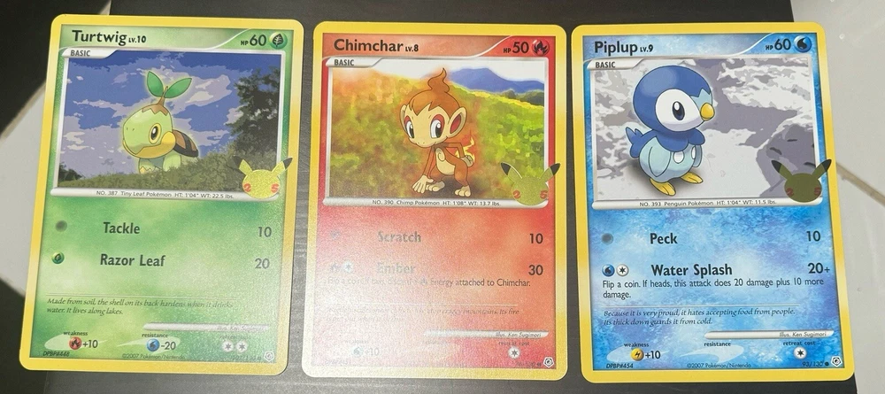 This set of Jumbo Sinnoh Starter Pokemon Cards includes all the cards you need to get started with your collection. The set features Turtwig, Chimchar, and Piplup, and is perfect for fans of the Pokemon Trading Card Game. The cards are oversized and come from the Jumbo manufacturer, ensuring high-quality and unique designs. These cards are a must-have for any collector or fan of the Pokemon franchise. The set is categorized under Toys & Hobbies and Collectible Card Games, making it a great addition to any collection. Don't miss out on the chance to add these rare and sought-after cards to your collection.