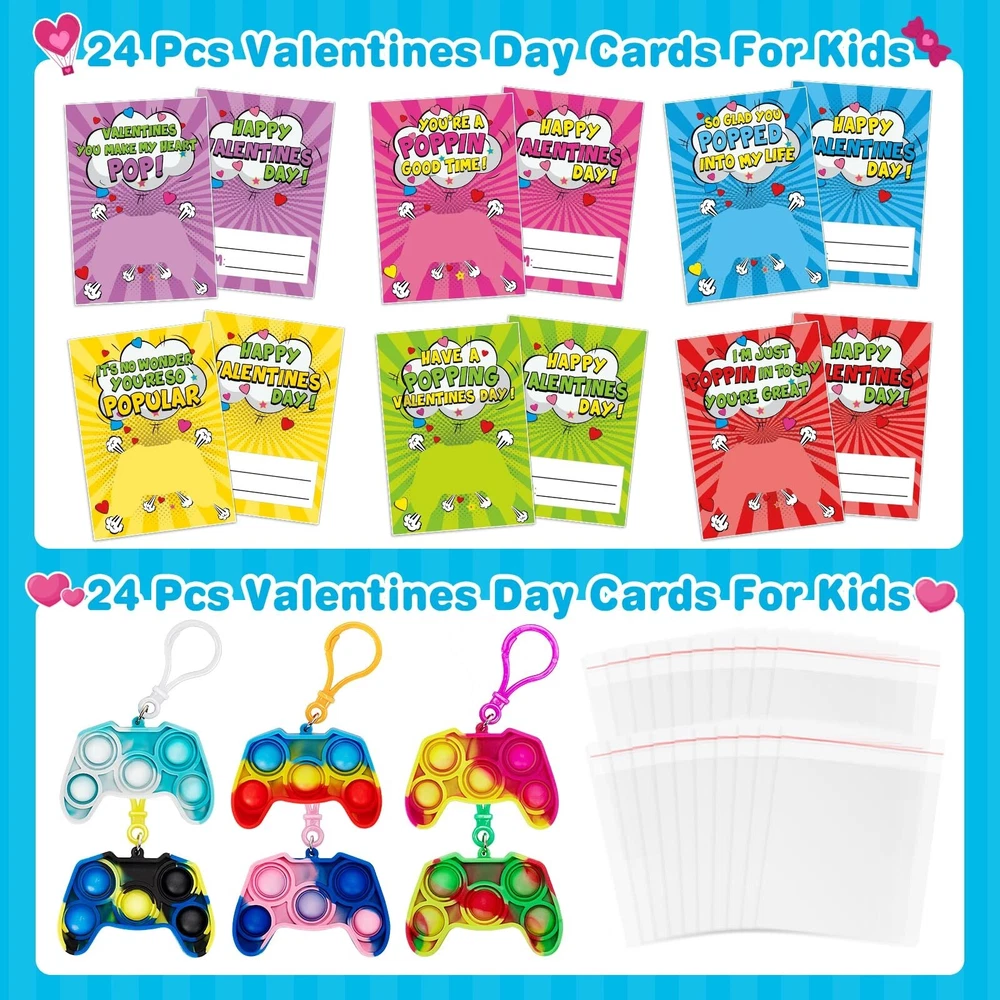 Jumlys Valentines Cards for Kids Classroom, 24 Pack Game Shape Pop Fidget Keychains Bulk, Valentines Gifts for Kids School, Ideal Exchange Prizes & Party Favors for Boys Girls Product Details Color: Multicolor Included Components: Paper Brand: Jumlys Item dimensions L x W x H: 1 x 0.3 x 1 inches Item Weight: 0.1 Pounds Product Dimensions: 1 x 0.3 x 1 inches Item Weight: 1.6 ounces Country of Origin: China Item model number: Valentine pop keychain Manufacturer recommended age: 36 months - 3 years Department: Unisex Kids Manufacturer: Jumlys Value Valentines Day Card Set For Kids - The package contains 24 cards with 6 different designs, and 24 pop fidget toys key chains with 6 colors. It is sufficient quantity can meet the needs of kids in various parties and is suitable for Valentine's Day gifts and classroom activity prizes, they will surprise the kids in Valentine's Day. Various Unique Designs - Our pop fidget toys key chains contain 6 different mixed color designs, and the cards are also designed with 6 different colors, which looks very colorful. Assembling the pop fidget toys key chains and cards together, the bright colors and unique designs immediately attract the attention of children, which is definitely an ideal choice for Valentine's Day gifts. Fun Toys for Boys and Girls - Our pop fidget key toy is made of high-quality materials, soft and flexible. Pressing it will be very relaxing, helping you get rid of stress, providing a pleasant and calming sensory experience, and the matching key chain can also be hung on school bags, keys, pencil cases, etc. Prepare this pop fidget key chain for your children and let them enjoy it at the Valentine's Day party. Ideal Valentines Day Exchange Gifts - Kids can write the name of the person they want to give on the card, and give these Valentine's Day cards to classmates, friends or family to express love for them. Let the children spend an unforgettable Valentine's Day together by exchanging Valentine's Day cards in class. Suitable For Many Occasion - This Valentines Day cards kit is perfect for children entertainment, kids Valentine's party favor supplies, preschool or elementary school classroom prize, school classroom gift exchange, class Valentine's event or any Valentine's occasions. Any child will be surprised and delighted to receive them.