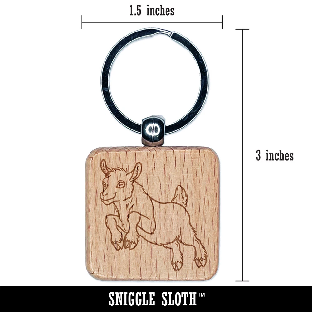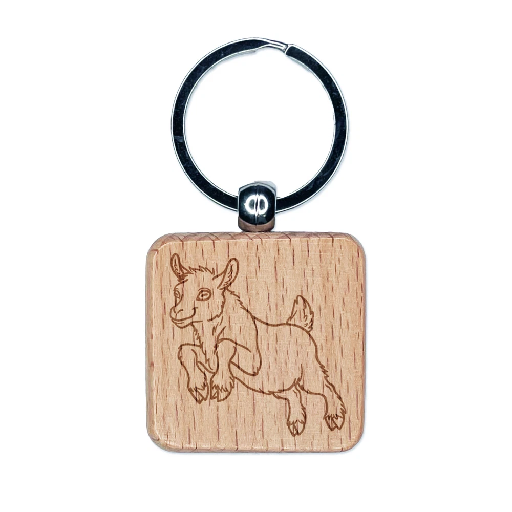 Jumping Baby Goat Engraved Wood Square Keychain Tag Charm