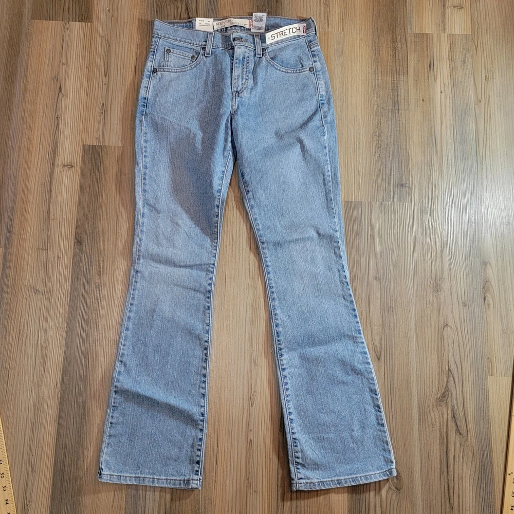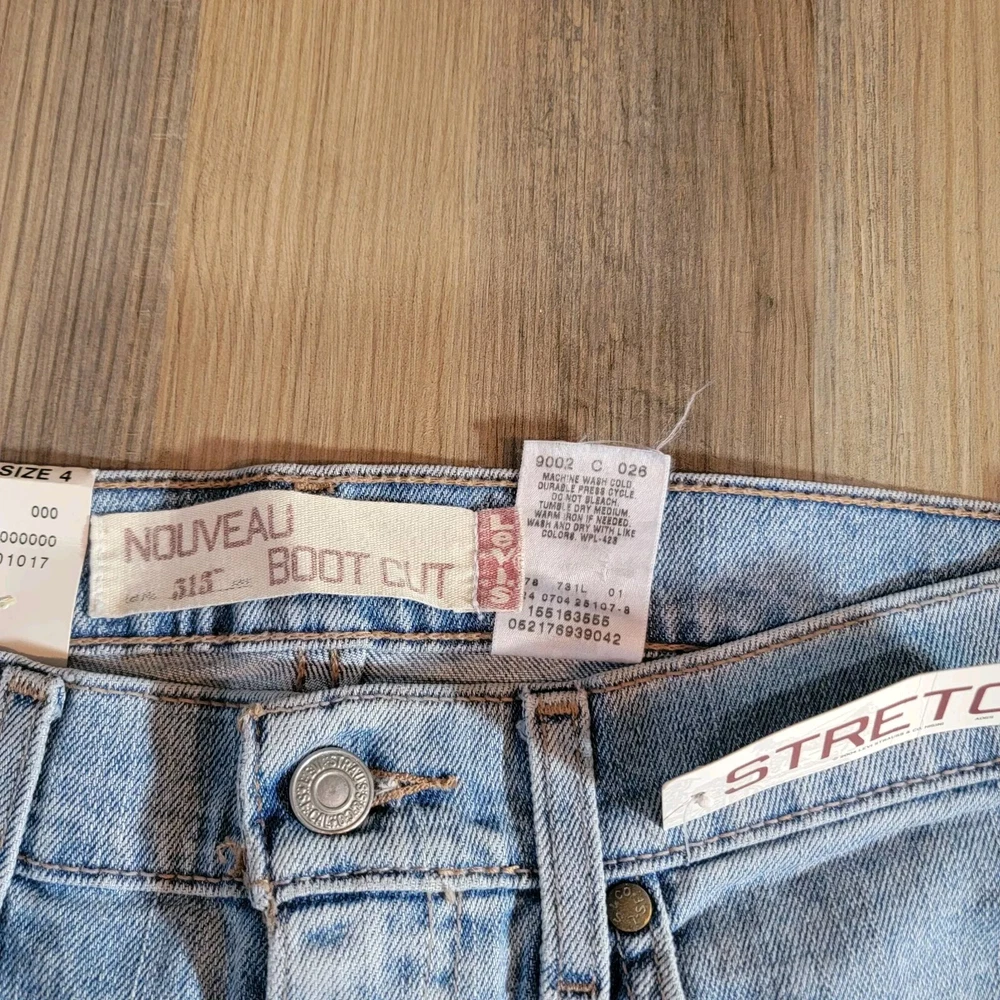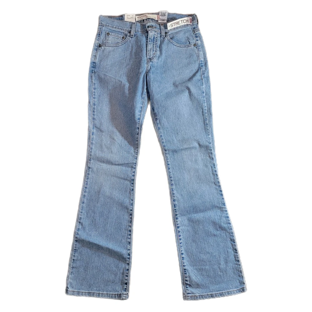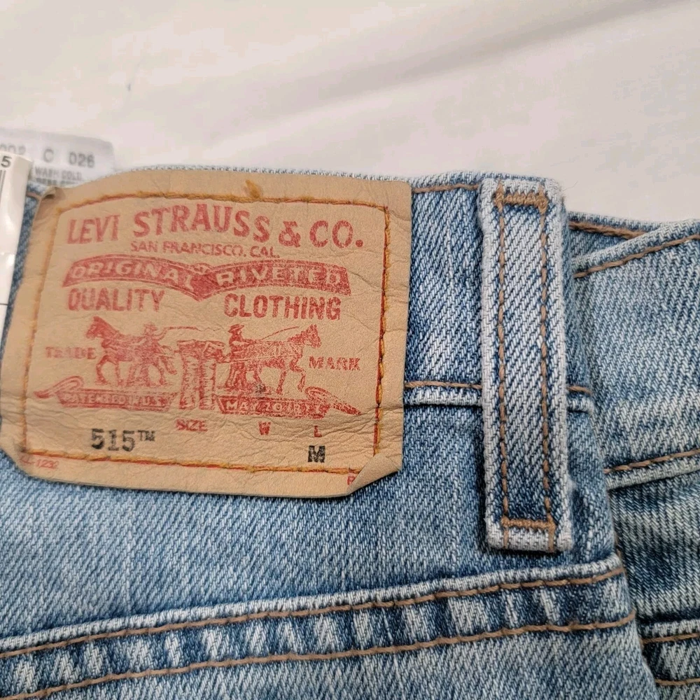 This is a pair of Junior's Levi's 515 Bootcut Jeans in size 4 with a light wash. The jeans feature a solid denim fabric with a mid-rise waist size of 28 inches and a 32-inch inseam. The closure is a combination of a zipper and button, accented with buttons, zippers, and a logo. Made from a comfortable cotton blend material with stretch, these regular fit jeans are designed with pockets and are suitable for casual wear.