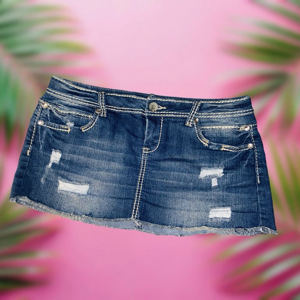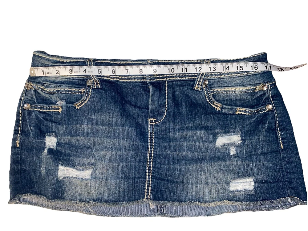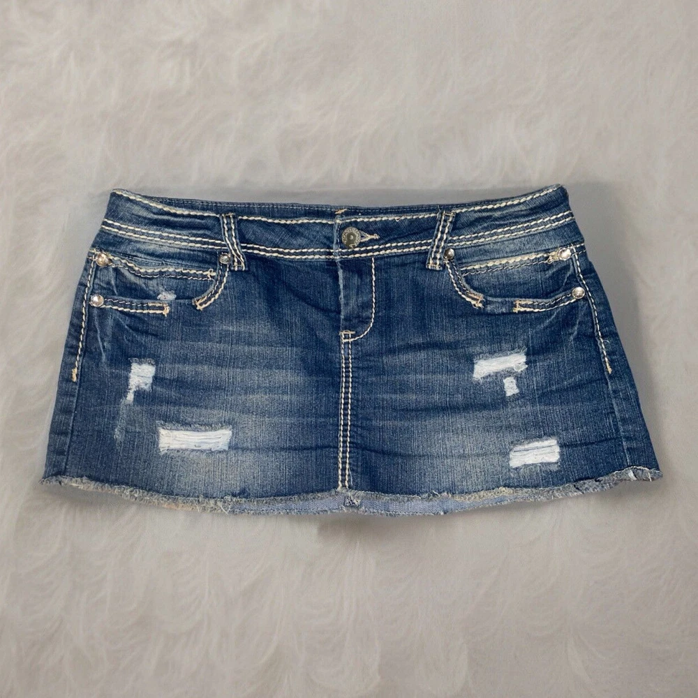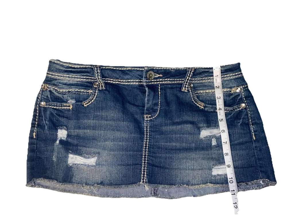 Fabric Type: Denim Color: Blue Features: Pockets, Stretch, Lightweight, All Seasons, Elastic Waist Garment Care: Machine Washable Character: Cowgirl, Mom, Skater Girl, Trixie, Fashionista, Y2K, Vintage, Trendy Rise: Low Style: Mini Skirt Length: Short Brand: Almost Famous Material: Cotton, Polyester, Spandex Country/Region of Manufacture: China Size Type: Juniors Type: Skirt Season: Fall, Spring, Summer, Winter Department: Women Pattern: Solid Vintage: Yes Theme: American, 90s, Bohemian, Beach, City, Festival, Hipster, Hippie, Hip Hop, Nautical, Preppy, Punk, Retro, Rock Size: 11 Closure: Zip Accents: Rhinestone, Button, Sequin, Studded, Zipper Handmade: No Occasion: Party/Cocktail, Casual, Travel, Workwear