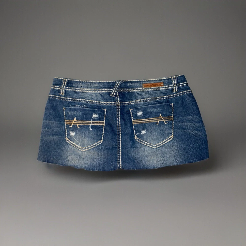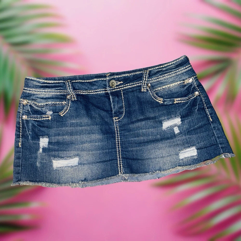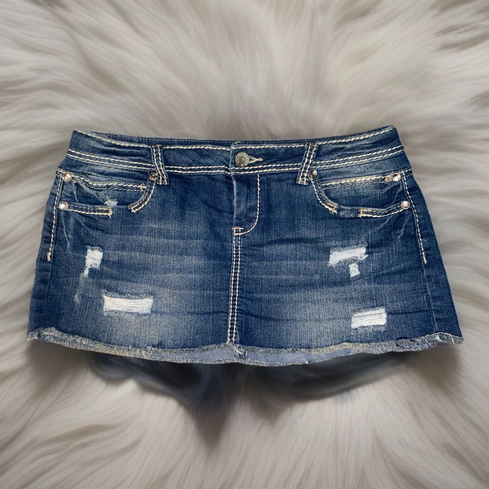 Fabric Type: Denim Color: Blue Features: Pockets, Stretch, Lightweight, All Seasons, Elastic Waist Garment Care: Machine Washable Character: Cowgirl, Mom, Skater Girl, Trixie, Fashionista, Y2K, Vintage, Trendy Rise: Low Style: Mini Skirt Length: Short Brand: Almost Famous Material: Cotton, Polyester, Spandex Country/Region of Manufacture: China Size Type: Juniors Type: Skirt Season: Fall, Spring, Summer, Winter Department: Women Pattern: Solid Vintage: Yes Theme: American, 90s, Bohemian, Beach, City, Festival, Hipster, Hippie, Hip Hop, Nautical, Preppy, Punk, Retro, Rock Size: 11 Closure: Zip Accents: Rhinestone, Button, Sequin, Studded, Zipper Handmade: No Occasion: Party/Cocktail, Casual, Travel, Workwear