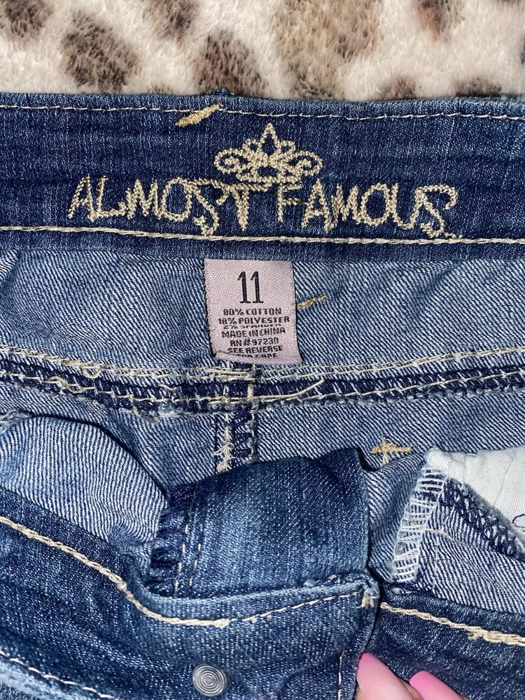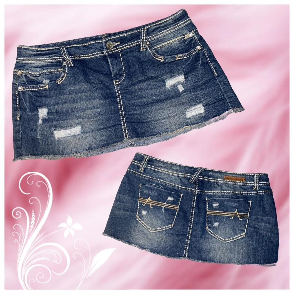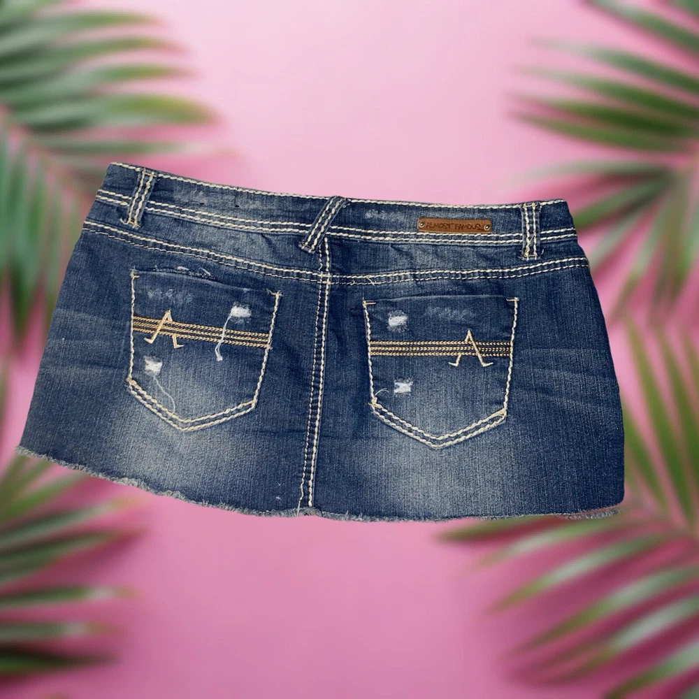 For sale here is this super cute & sexy denim mini skirt from the iconic Y2K brand ALMOST FAMOUS! Preowned in perfect condition! ITEM DETAILS & FEATURES: • Wash: Dark Wash • Size: 11 US Women/Juniors • Super soft denim with a slight stretch • Belt loops on waist with sparkly rhinestone accents • 6 pocket design - 4 functional front pockets & 2 functional embroidered back pockets • Zip-fly front closure with button • Distressed skirt hem • Skirt Length: 11" • Waist laying flat: 16” • Versatile style - dress up or down • For women and juniors