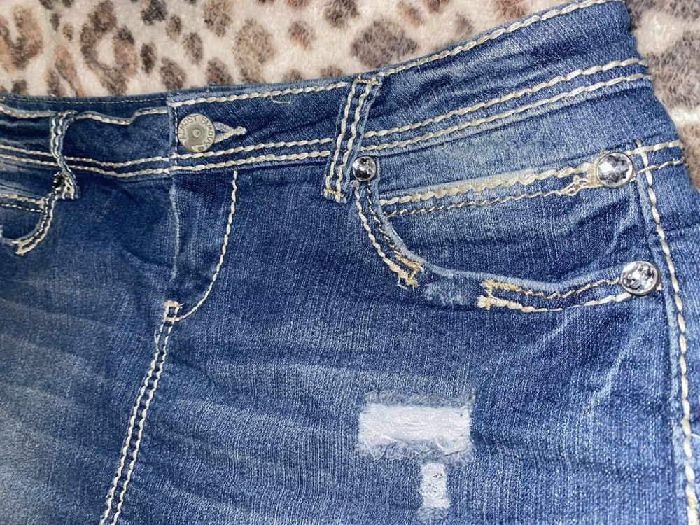 Juniors’ Y2K ALMOST FAMOUS Embellished Low-Rise Distressed Denim Miniskirt | 11
