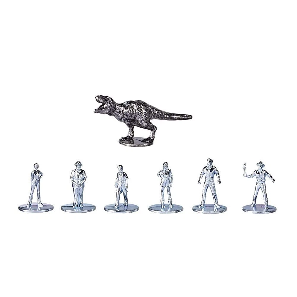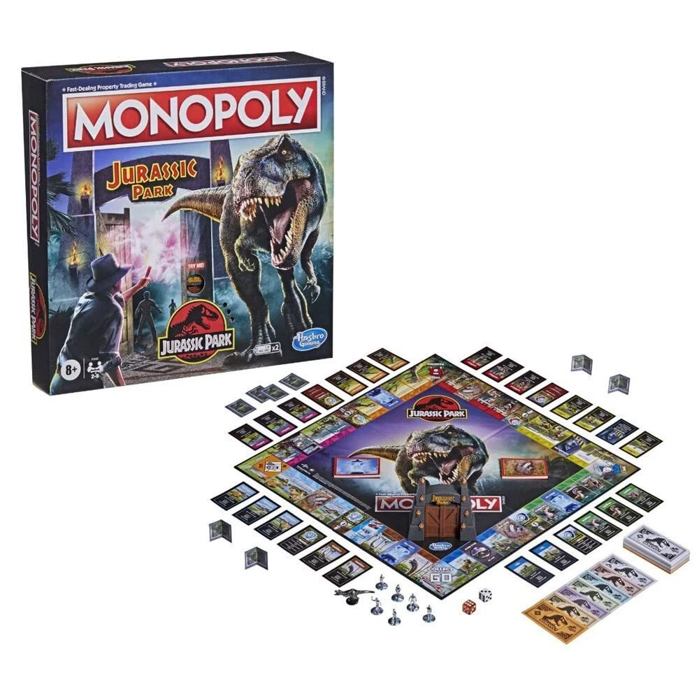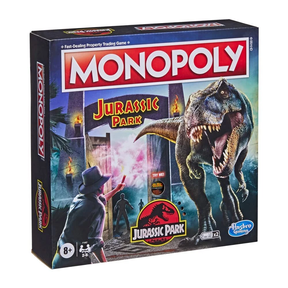 Secure dinosaur paddocks and other areas but beware of the T. Rex; it doesn't follow rules! Build fences to protect paddocks from the attack and earn money by charging rent, but prepare for damaged property. Activate the gate to hear the Jurassic Park movie theme song or a dinosaur roar, which will determine how much money to collect. The last player with money when all others have gone bankrupt wins. The game also ends if the T. Rex damages all properties before they can be protected with fences or repaired. Then everyone loses! The : Jurassic Park Edition game is for kids ages 8 and up. GAME WITH JURASSIC PARK THEME: Secure the park and avoid a rampaging T. Rex! Get ready for exciting gameplay, artwork, sound effects, and tokens inspired by the hit movie GATE WITH MUSIC AND SFX: Get money when passing or landing on Go by activating the electronic Jurassic Park gate. Whether it plays the Jurassic Park movie theme or a dinosaur roar determines the amount INCLUDES T. REX TOKEN: Play as a character from the original Jurassic Park movie but also move the T. Rex token on each turn. And beware! The T. Rex can damage property and force players to pay the Bank BUILD PROTECTIVE FENCES: Build a fence as soon as one dinosaur paddock in a color set is owned. Fences allow players to charge more rent and protect properties from the T. Rex FOR JURASSIC PARK FANS: The : Jurassic Park Edition game is a fun twist on classic gameplay and makes a great gift idea for fans of the Jurassic Park movie, and kids ages 8 and up