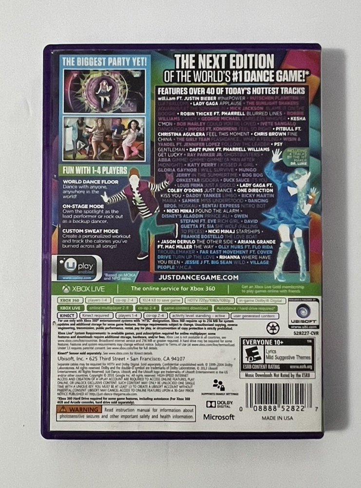 Enjoy hours of fun with Just Dance 4 for the Microsoft Xbox 360! This Kinect-compatible game is perfect for kids, family gatherings, and parties, offering exciting songs and dance routines everyone can enjoy. Disc, case, and artwork all in very good condition Fully tested and working with Xbox 360 Kinect sensor Great for family game nights and fun exercise Ships fast with care so you can start dancing right away!