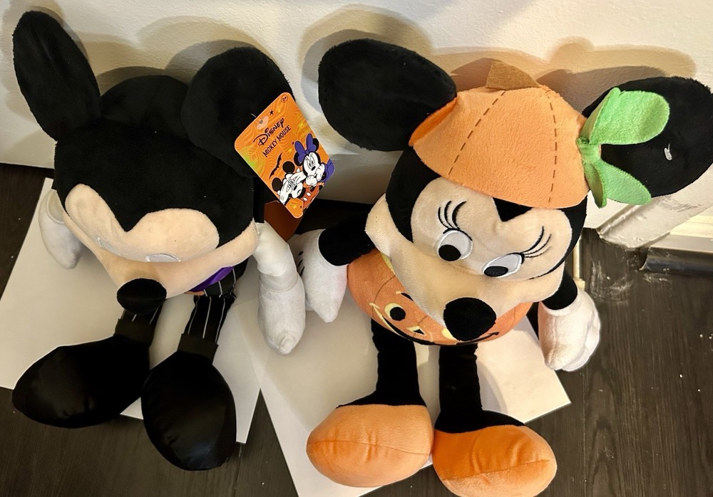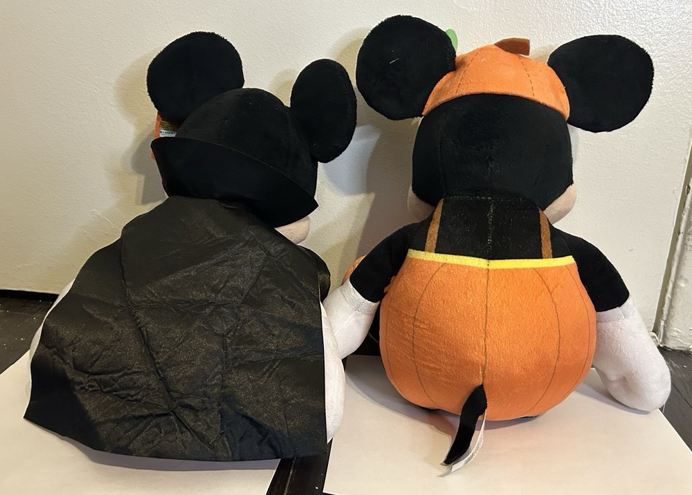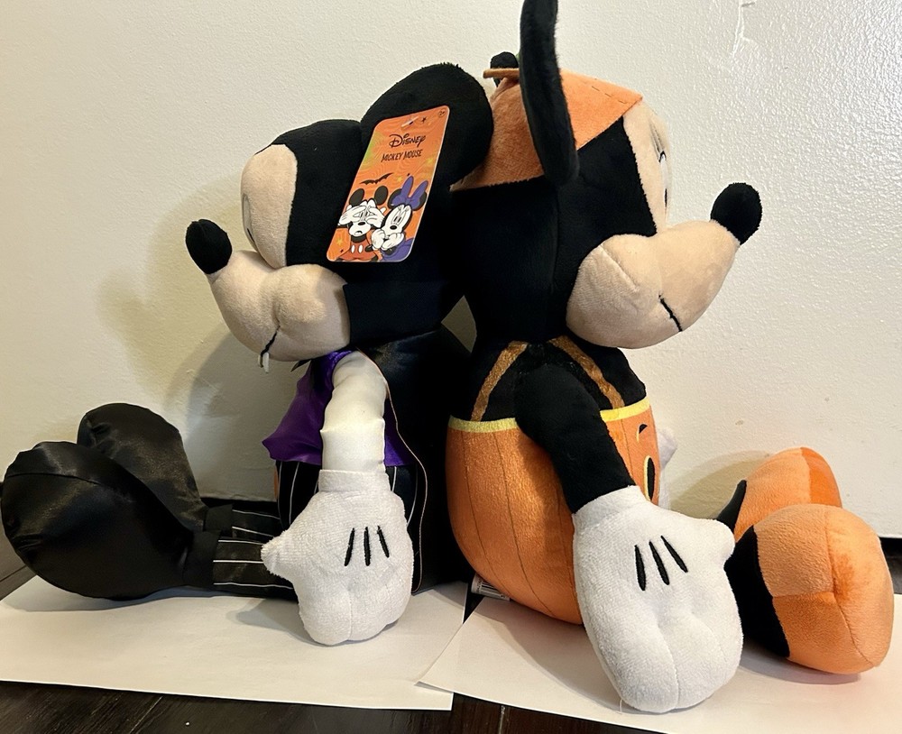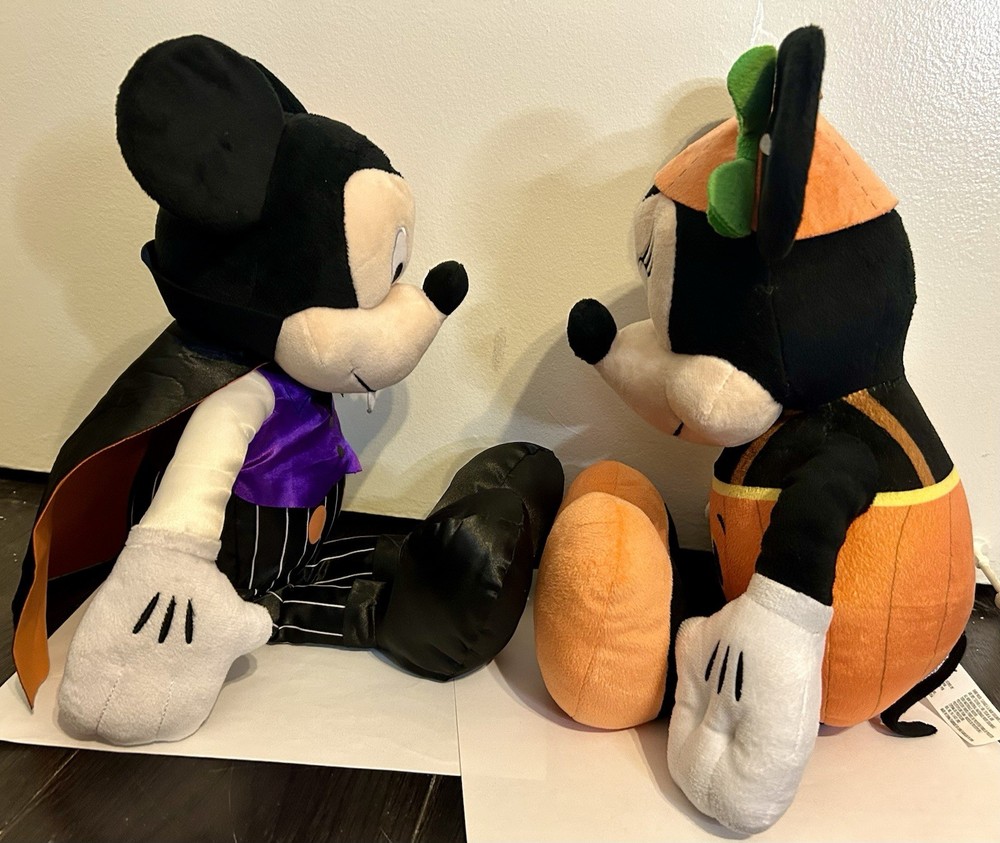 The Just Play Disney Mickey & Minnie Mouse Halloween Plush toys are collectible plush toys featuring the iconic characters Mickey and Minnie Mouse from Disney dressed in Halloween costumes. Mickey is dressed as a Vampire and Minnie is dressed as a pumpkin. Mickey is in excellent condition, still has tags. Minnie shows some slight signs of use, but is also in excellent condition. Both are 18” high and make great Halloween decorations.