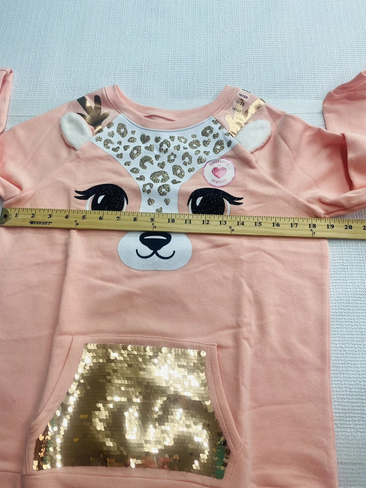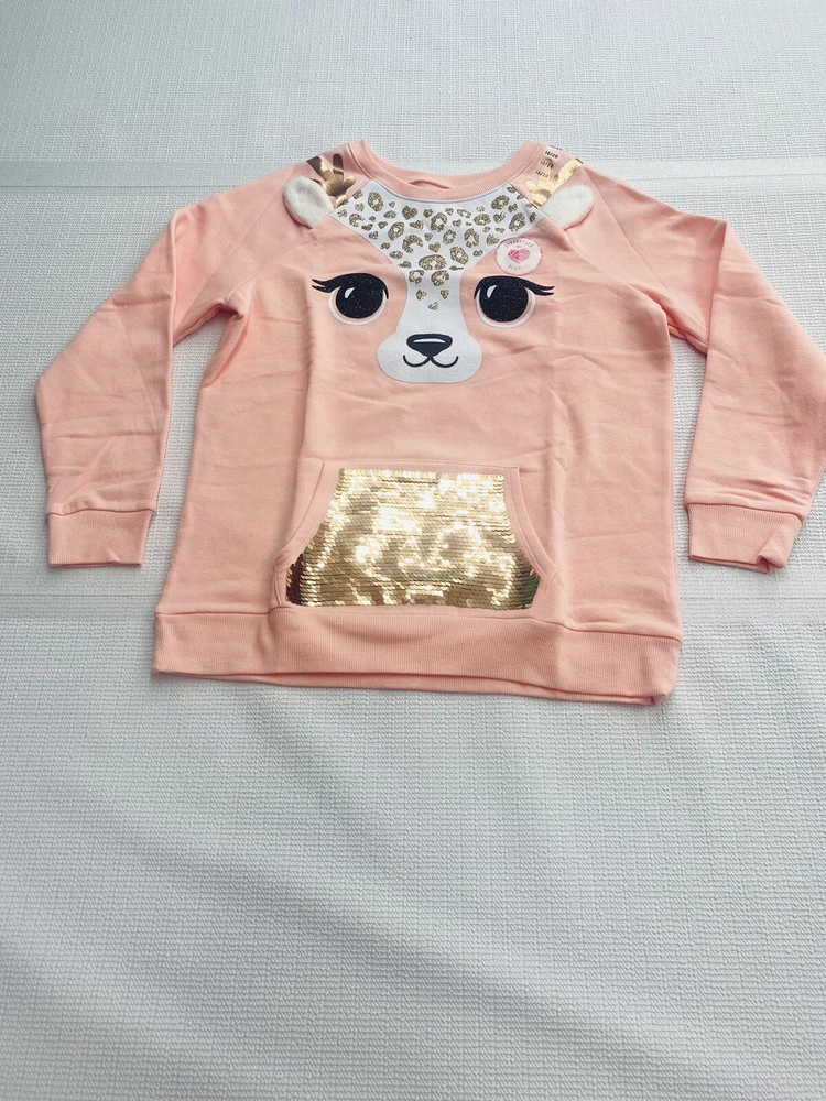 Add some sparkle to your little girl's wardrobe with this Justice Girls 18/20 Pink Glitter Reindeer Sequin Pocket Fleece Sweater. The pullover style sweater features a round neckline and long sleeves, perfect for keeping your little one cozy during the holiday season. The faux fur, polyester, and cotton material make it a durable and comfortable choice for both casual and party occasions. The sweater is adorned with glitter accents and features a cute reindeer design, making it a perfect addition to your little girl's anime and animal-themed wardrobe. It also comes with pockets, making it a practical choice for everyday wear. This sweater is a must-have for any parent looking to add some fun and festive flair to their child's wardrobe.