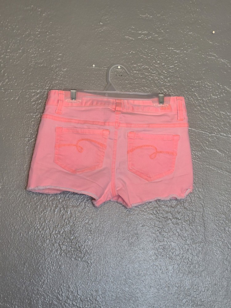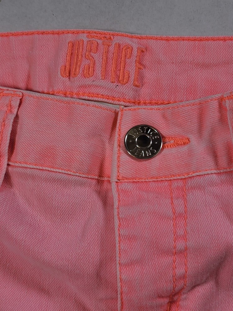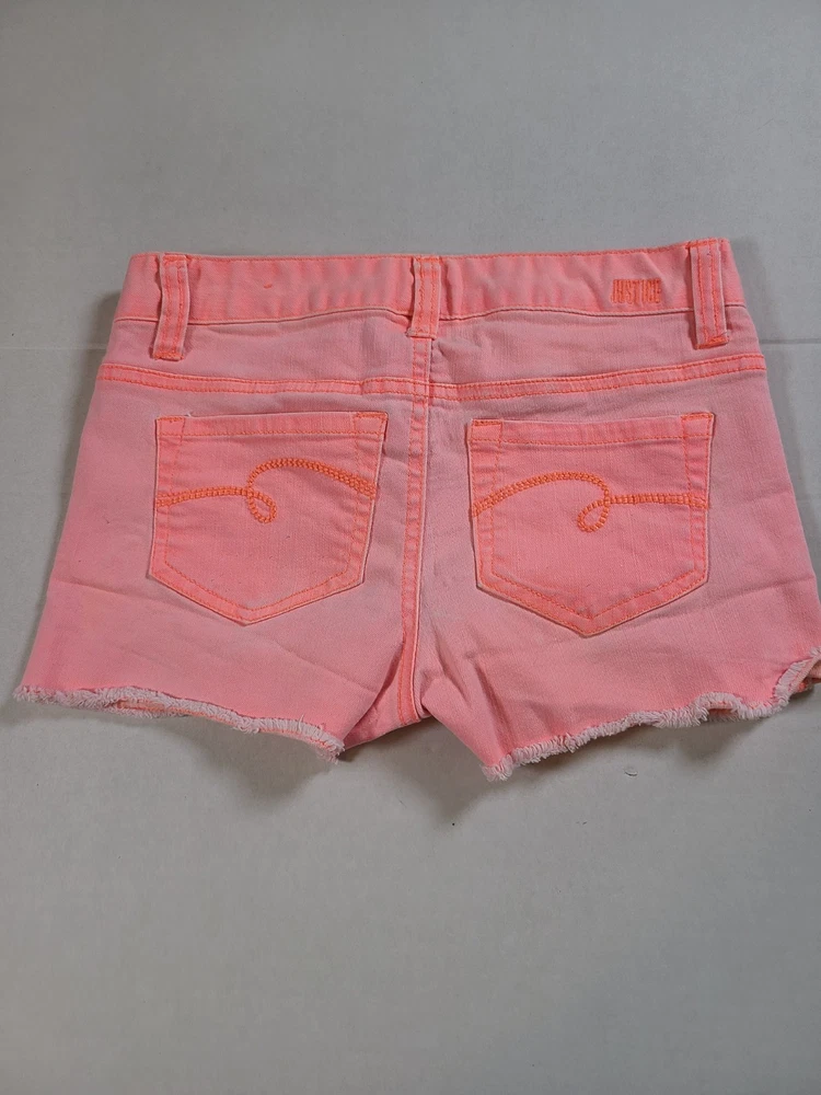 The product is a pair of cute size 14 slim fray hem shorts in light pink from the brand Justice. These denim shorts feature a solid pattern with a zip closure, making them perfect for travel, activewear, and casual occasions. With a slim fit and slimming features, these shorts are ideal for various activities such as walking, beach trips, and school. Easy to care for with machine washable fabric and suitable for all seasons, these shorts are a stylish and versatile addition to any young girl's wardrobe. Justice girls size 14 slim light pink low rise Jean Shorts. Excellent pre-owned condition. 5 pockets, a button, and a zipper, 68% cotton, 18% polyester, 11% viscose, and 3% elastane. These cute, well taken care of shorts are great for school, play, or a causal outing. See photos for measurements approximate EUC