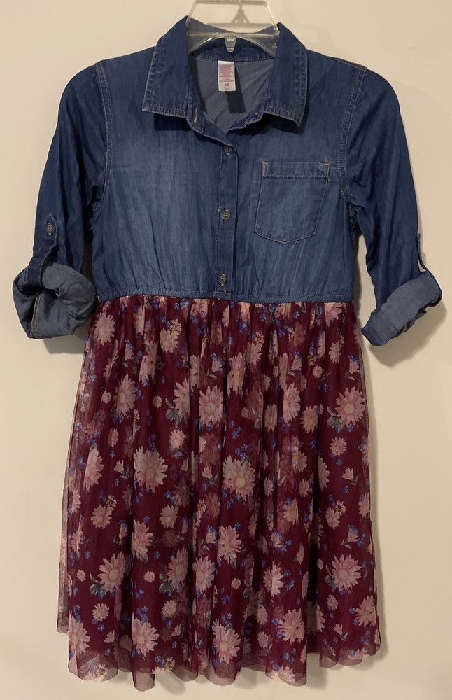 Justice, Girls, Size 12, Blue and Burgundy, Floral, Knee-Length, Dress! A2755. This is a beautiful stylish dress in excellent condition!! The material is made of cotton, lyocell, and polyester. The length from shoulder to hem is 33 inches. The lower part of the dress is layered and flowy. The sleeves are long, but can be buttoned up to 3/4 sleeves.