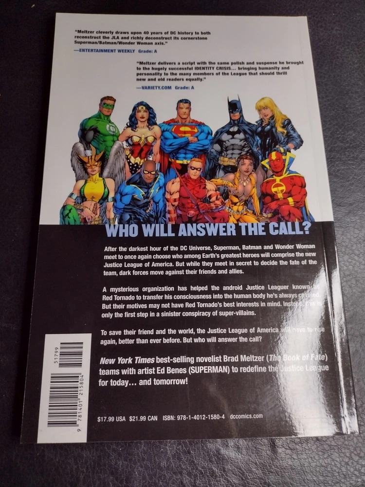 Series Title: Justice League of America Cover Artist: Peter Steigerwald, Michael Turner Character: Professor Ivo (Cameo), Mr. Terrific, Justice League of America Black Lightning, Vixen, Cavalier, Atom (Ray Palmer), Blue Beetle, The Parasite, Dr. Light (Kimiyo Hoshi), Justice League of America Superman, Hawkman, Justice League International Mr. Miracle, Hawkgirl, Batman (Bruce Wayne), Red Tornado, Plastique (Cameo), Kathy Sutton Zatanna (Cameo), Red Tornado (John Smith), Kathy Sutton, Phantom Stranger, Trident, Aquaman, Power Girl, Hawkwoman, Starro, Traya, Gold, Arsenal, Wonder Woman (Diana Prince), Gypsy, Original Justice League Superman, Green Arrow, Detroit Justice League Vibe, Guy Gardner, FireHawk, Zatanna, Prince Brion Markov (Geo-Force), Firestorm, Green Lantern (Hal Jordan), Dr. Will Magnus, Red Tornado Android, Black Lightning, Wonderwoman, Martian Manhunter, The Signalman (Phil Cobb), Professor Ivo, Solomon Grundy, Snapper Carr (Flashback in A Photograph), Cyborg (All Pictures on A Table of Potential League Members), Prince Brion Markov, Electrocutioner, Dr. Alina Raileanu, Amazo, Felix Faust (in Disguise), Black Canary, Captain Marvel, Geo-Force, Doctor Impossible (Villain, Introduction), Supergirl, Dr. Fate, Superman (Clark Kent), Martian Manhunter (Flashback), Dr. Light, Flash, Oberon, Flash (Wally West) (Flashback in A Photograph), Cameos of Potential Members: Supergirl, Trident (Revealed to Karate Kid (Val Armorr)), Tina (Of the Metal Men), Cameos (Pictures of Potential Members) : Captain Marvel, Trident (Cameo), Dr. Impossible, Green Arrow (Oliver Queen), Booster Gold, Parasite, Nightwing, Steel, Atom, Platinum (Tina), Red Arrow, The Flash (Bart Allen), Plastique, Green Lantern (Kyle Rayner) (Flashback in A Photograph), Amazo (Cameo), Starro Possessors, Electrocutioner (Cameo), Captain Marvel (Flashback in A Photograph), Cameos: Mr. Terrific (Michael Holt), Green Lantern, Elongated Man, Flash (Barry Allen) Genre: Superheroes Tradition: US Comics Publication Year: 2008 Artist/Writer: Brad Meltzer, Sandra Hope, Dick Dillin, Ed Benes, Mariah Benes, Dick Giordano, Alex Sinclair Issue Number: 1 Superhero Team: Justice League of America Era: Modern Age (1992-Now) Language: English Publisher: DC Comics